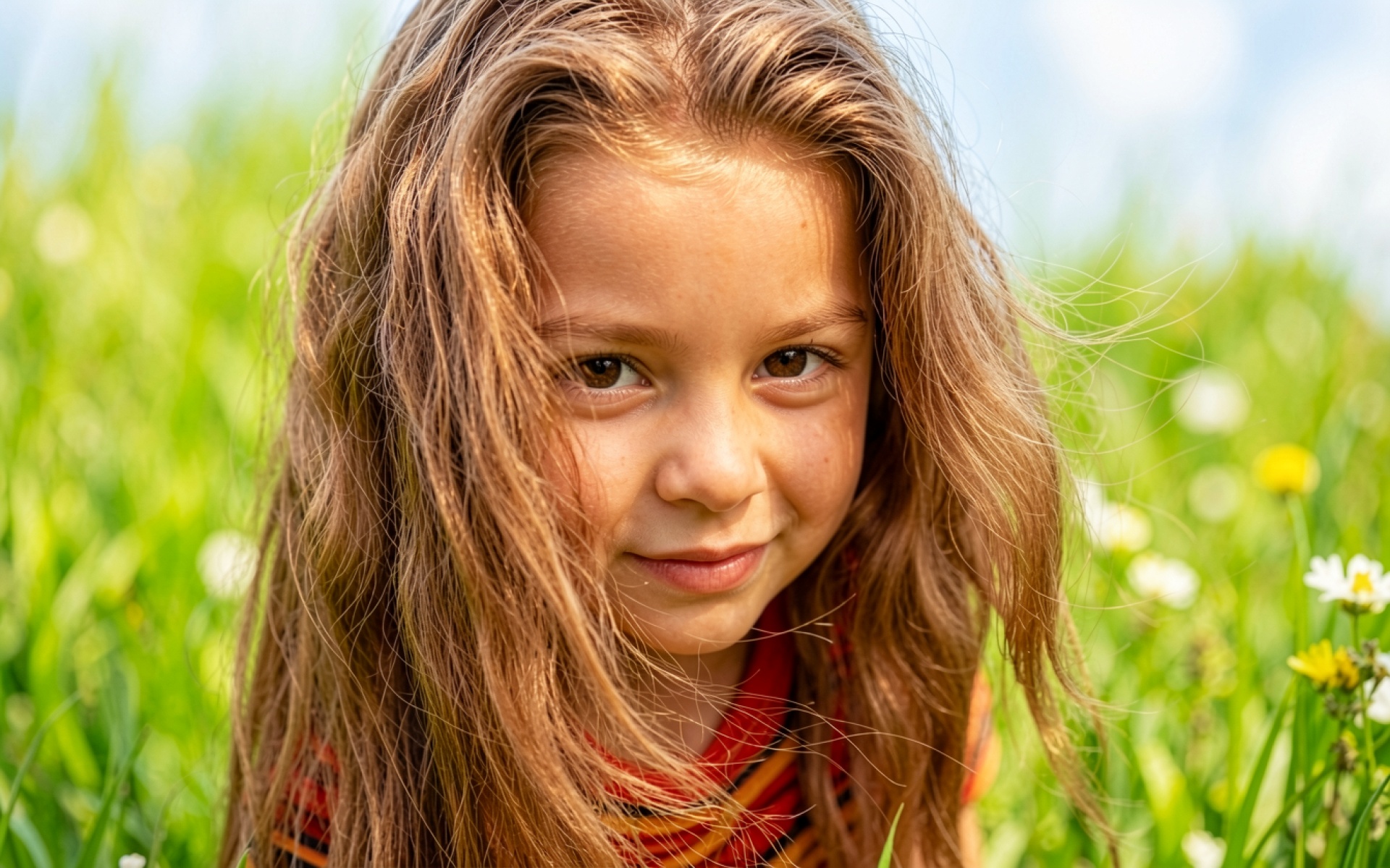 Девочка с русыми волосами в летнем лугу