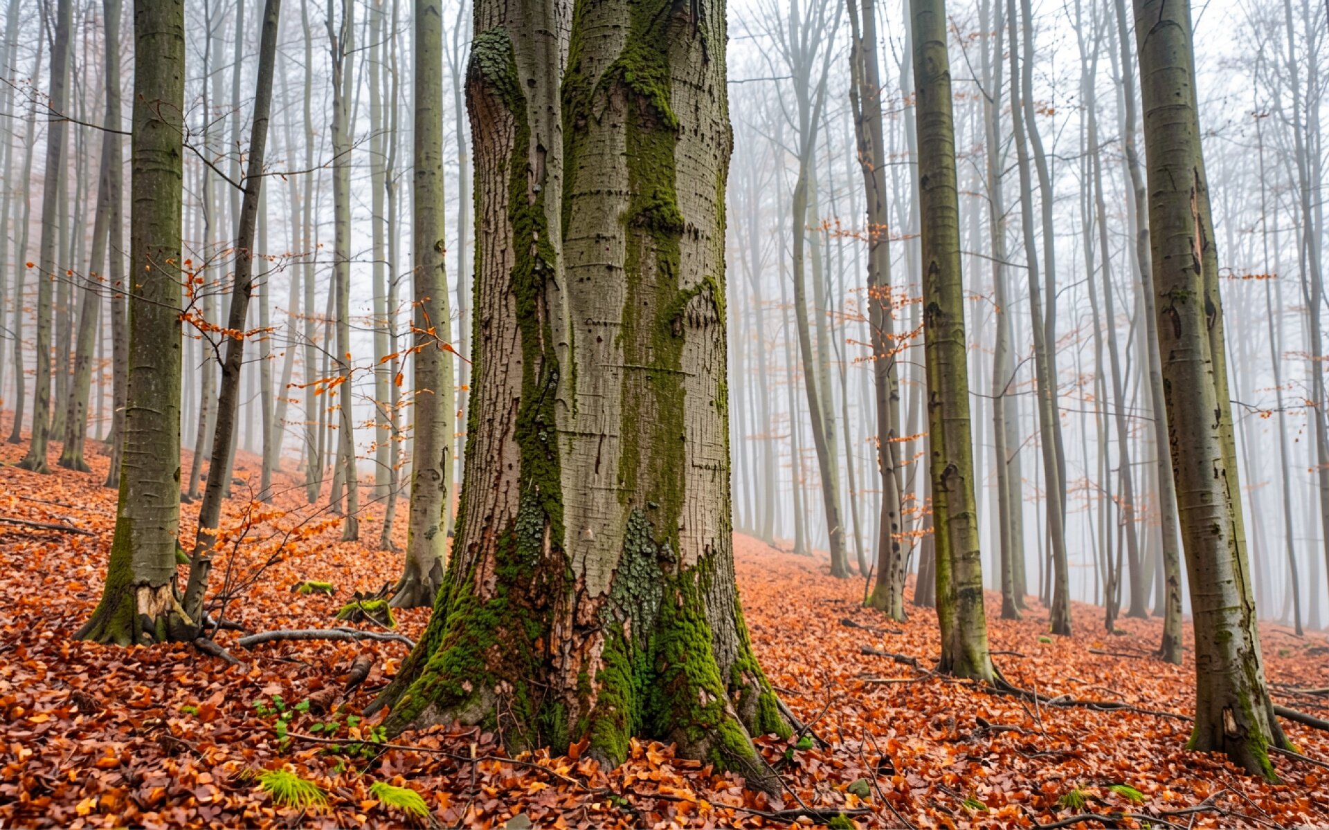 Буковый лес в тумане с рыжей листвой