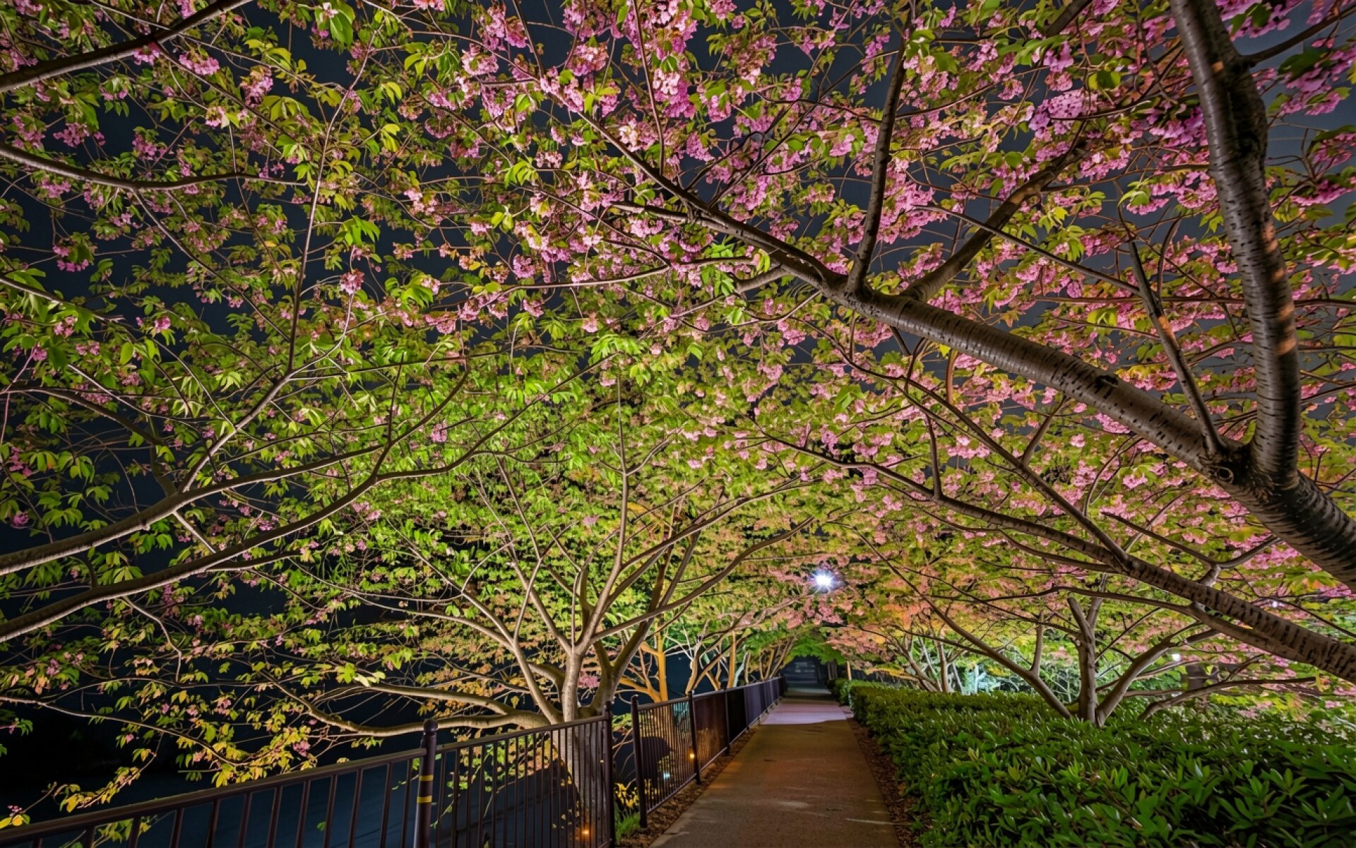 Цветущая сакура розового цвета в ночном парке