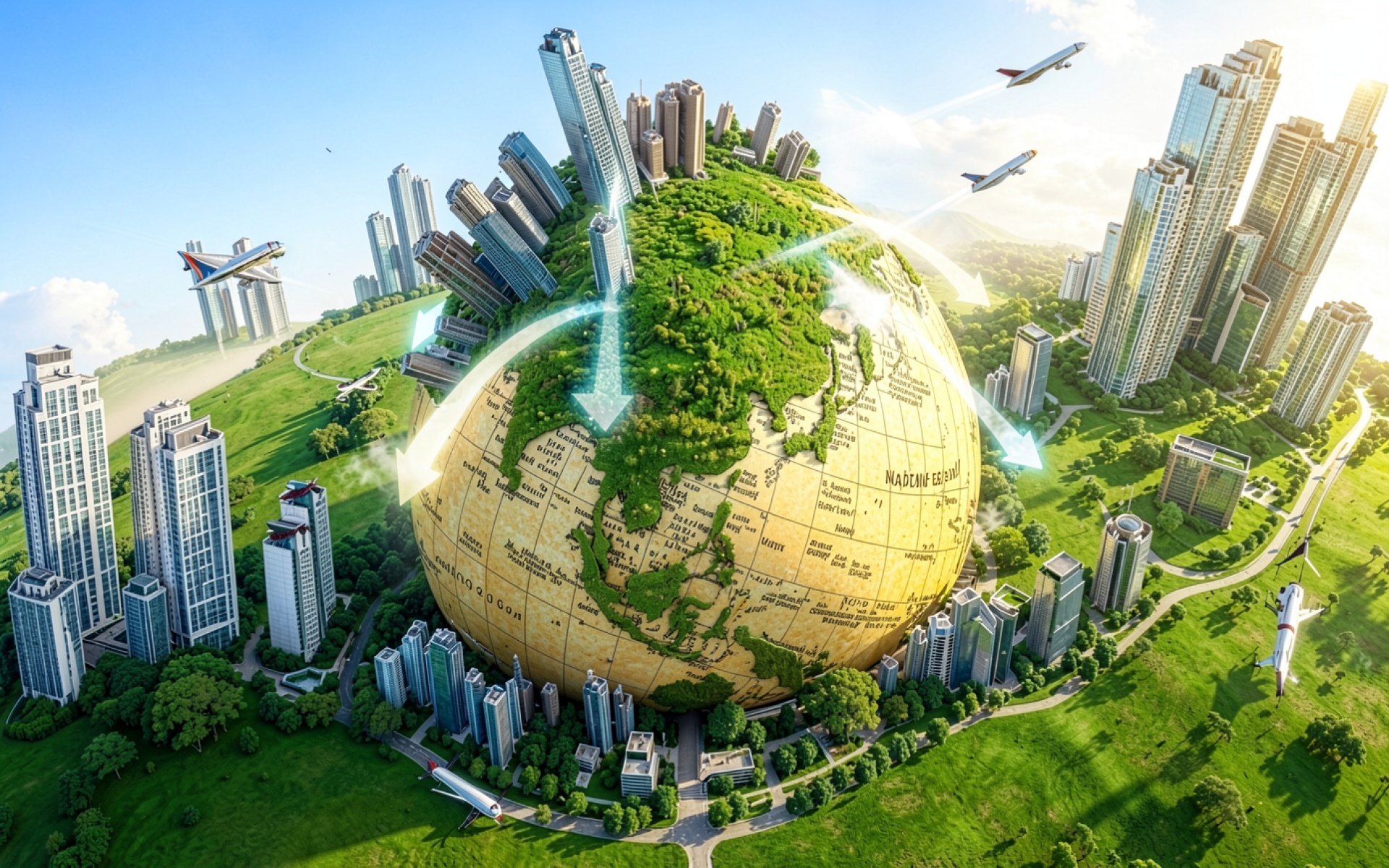 Футуристический город вокруг зеленого глобуса с самолетами