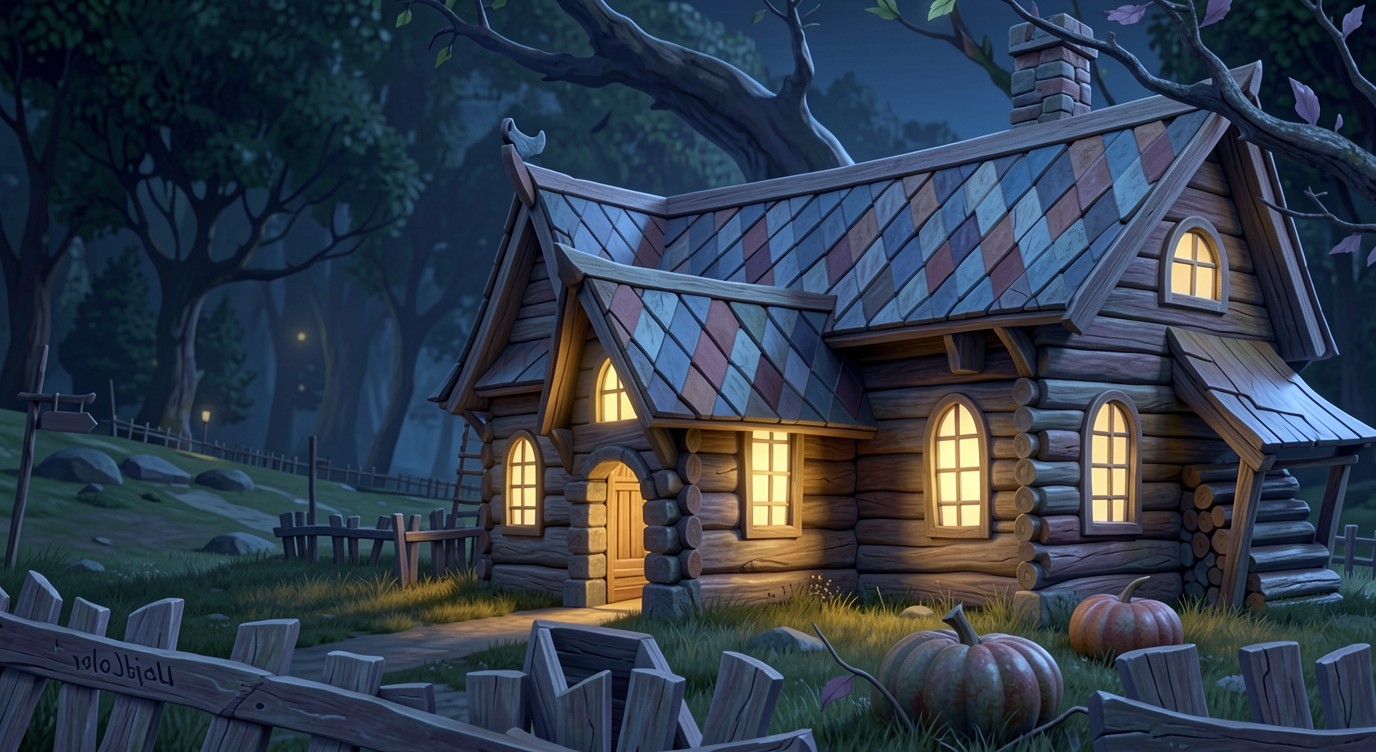 Уютный деревянный домик в ночном сказочном лесу