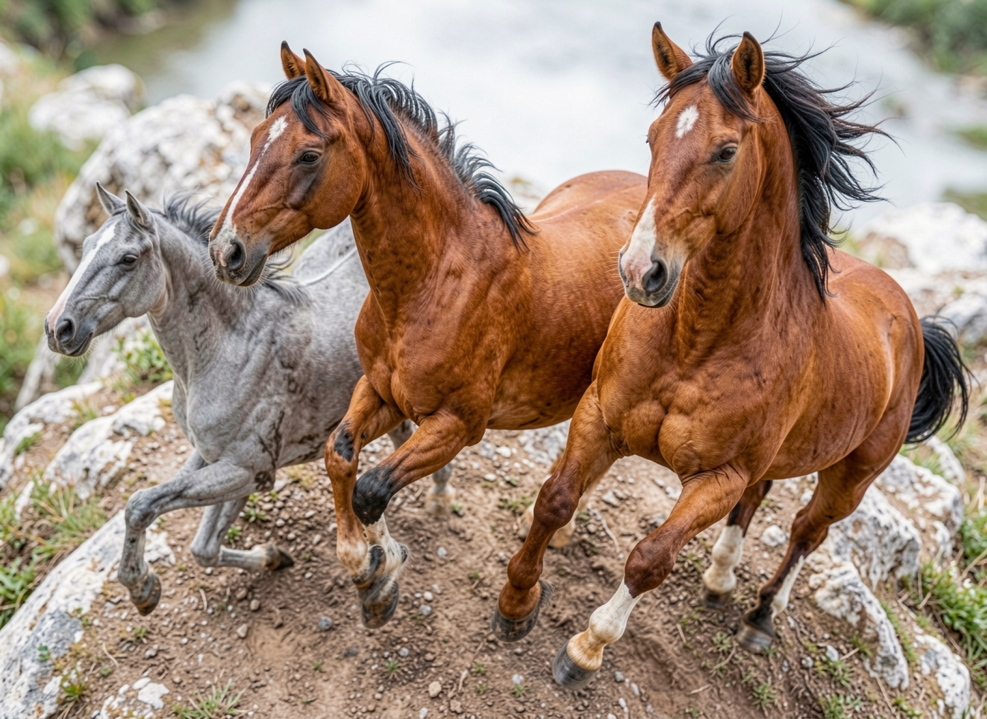 Три скачущие лошади в горном ландшафте