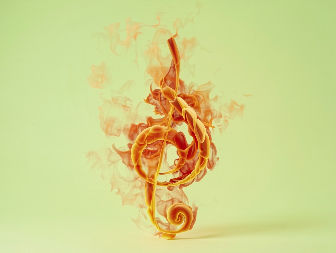 Скрипичный ключ из огня на желтом фоне