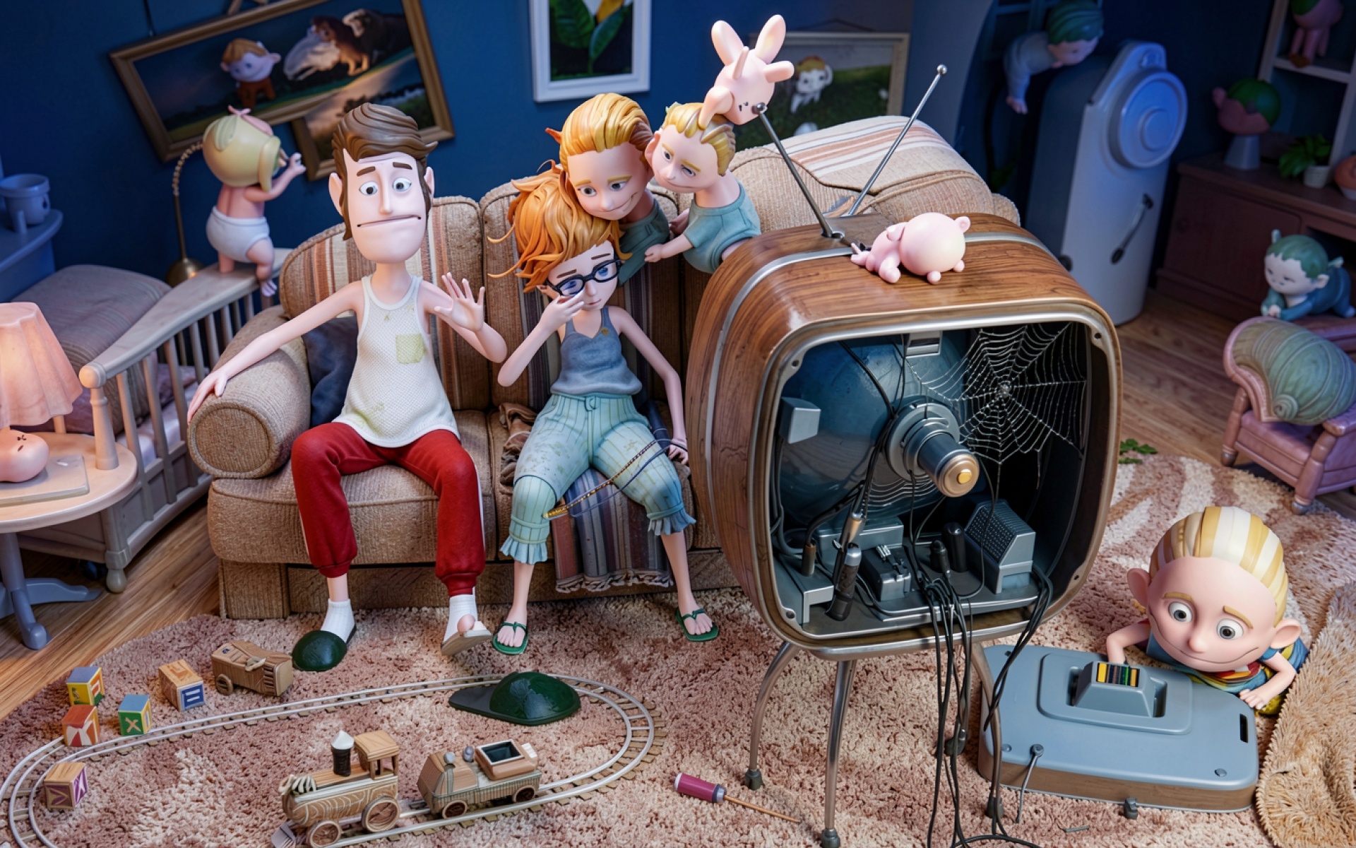 Семья в гостиной перед сломанным ретро телевизором