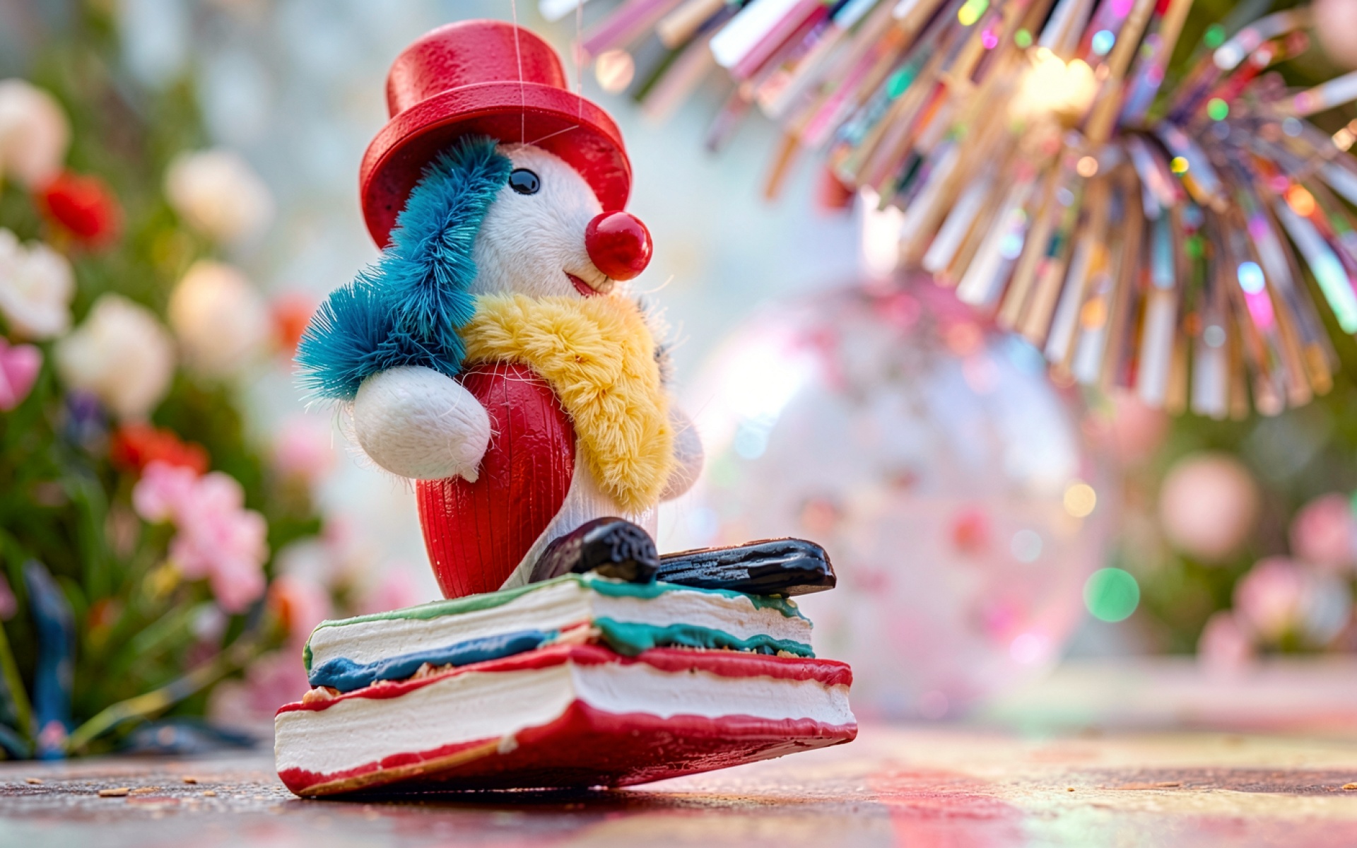 Фигурка снеговика в красном цилиндре на книгах