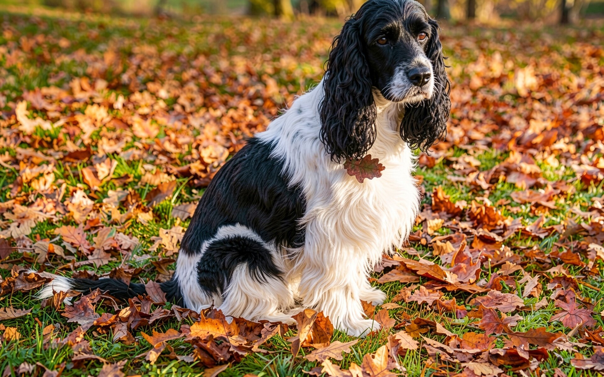 Черно-белый спаниель среди осенних рыжих листьев