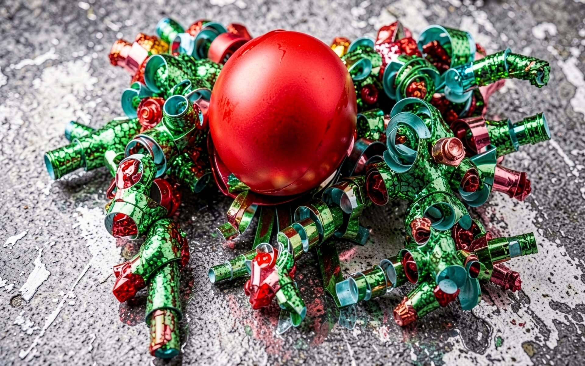 Красный шар в зеленом металлическом сплетении
