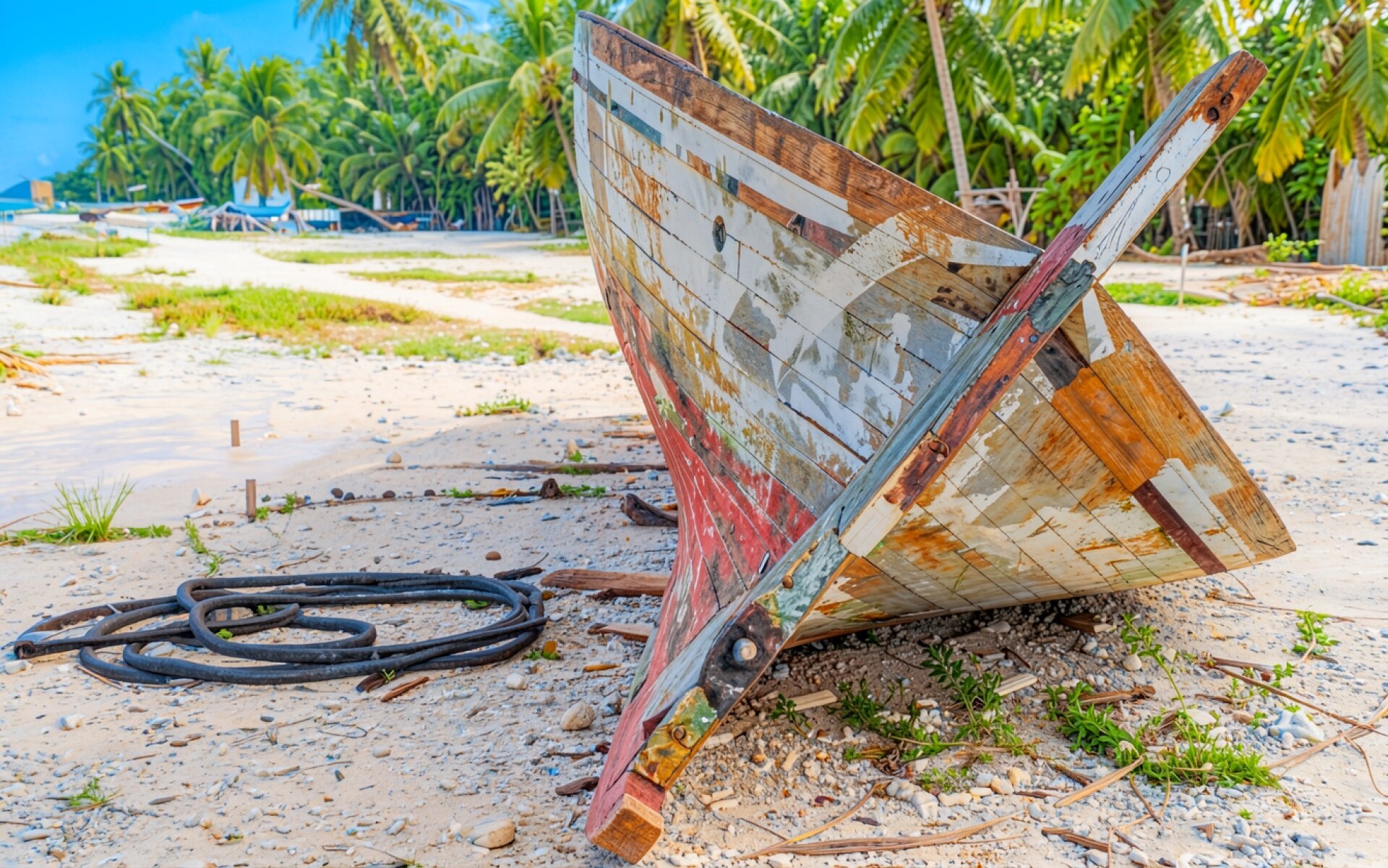 Старая деревянная лодка на тропическом пляже