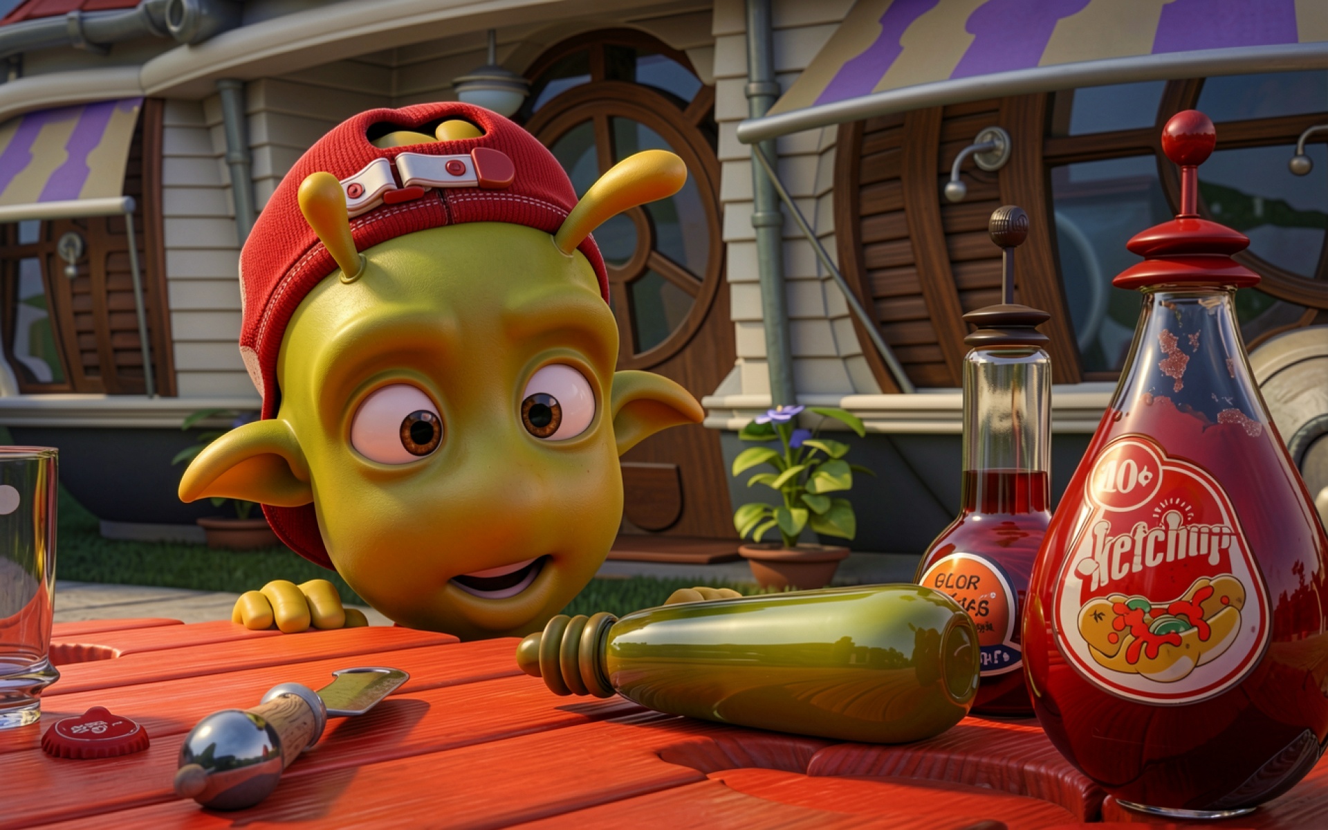 Зеленый инопланетянин в красной кепке за столом