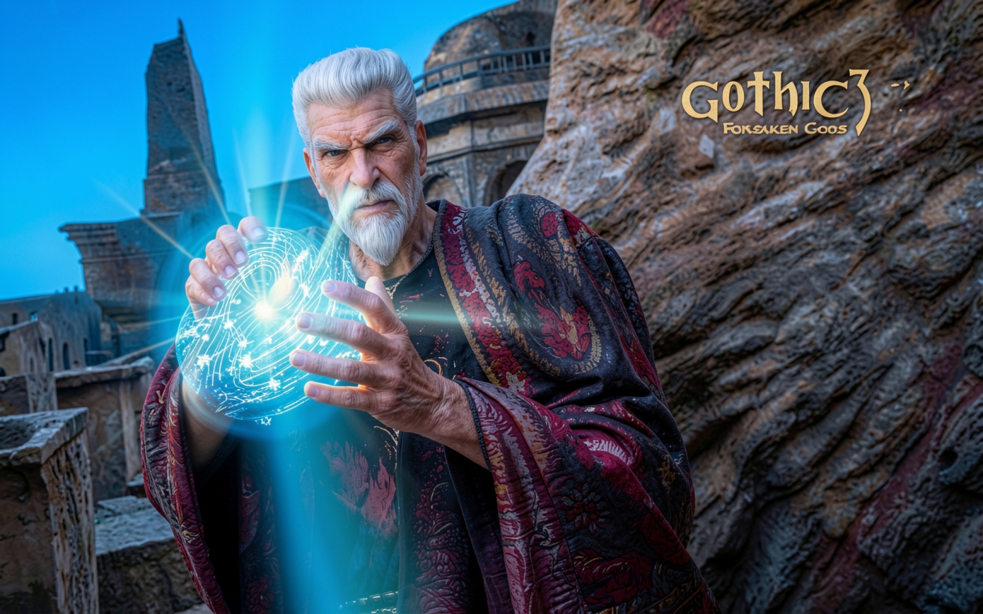 Маг Ксардас с синей магической сферой в горах