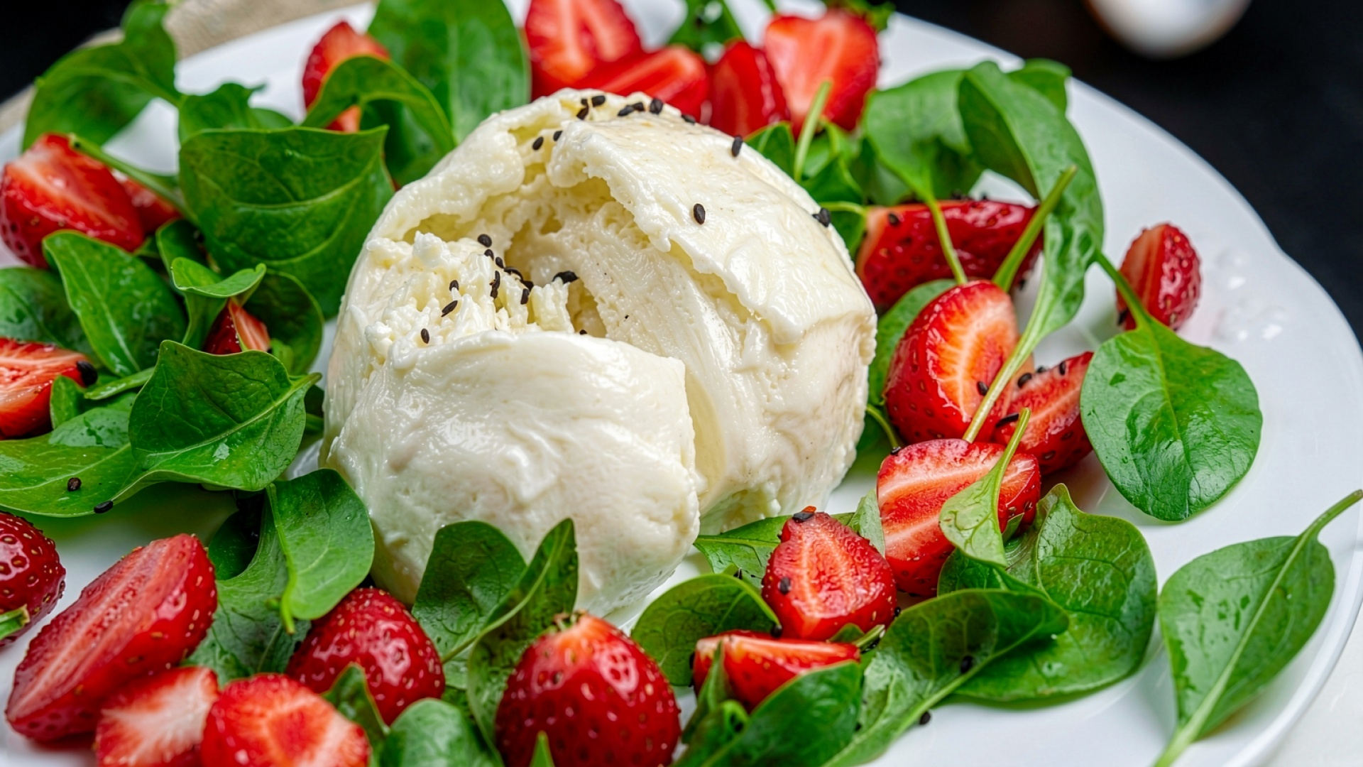Сыр буррата с клубникой и шпинатом