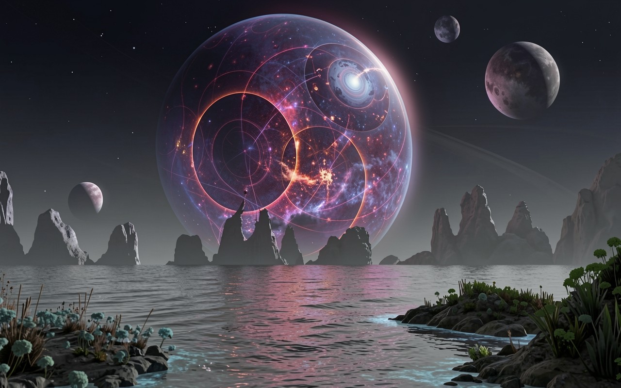 Сюрреалистичная планета с неоновыми линиями в космосе
