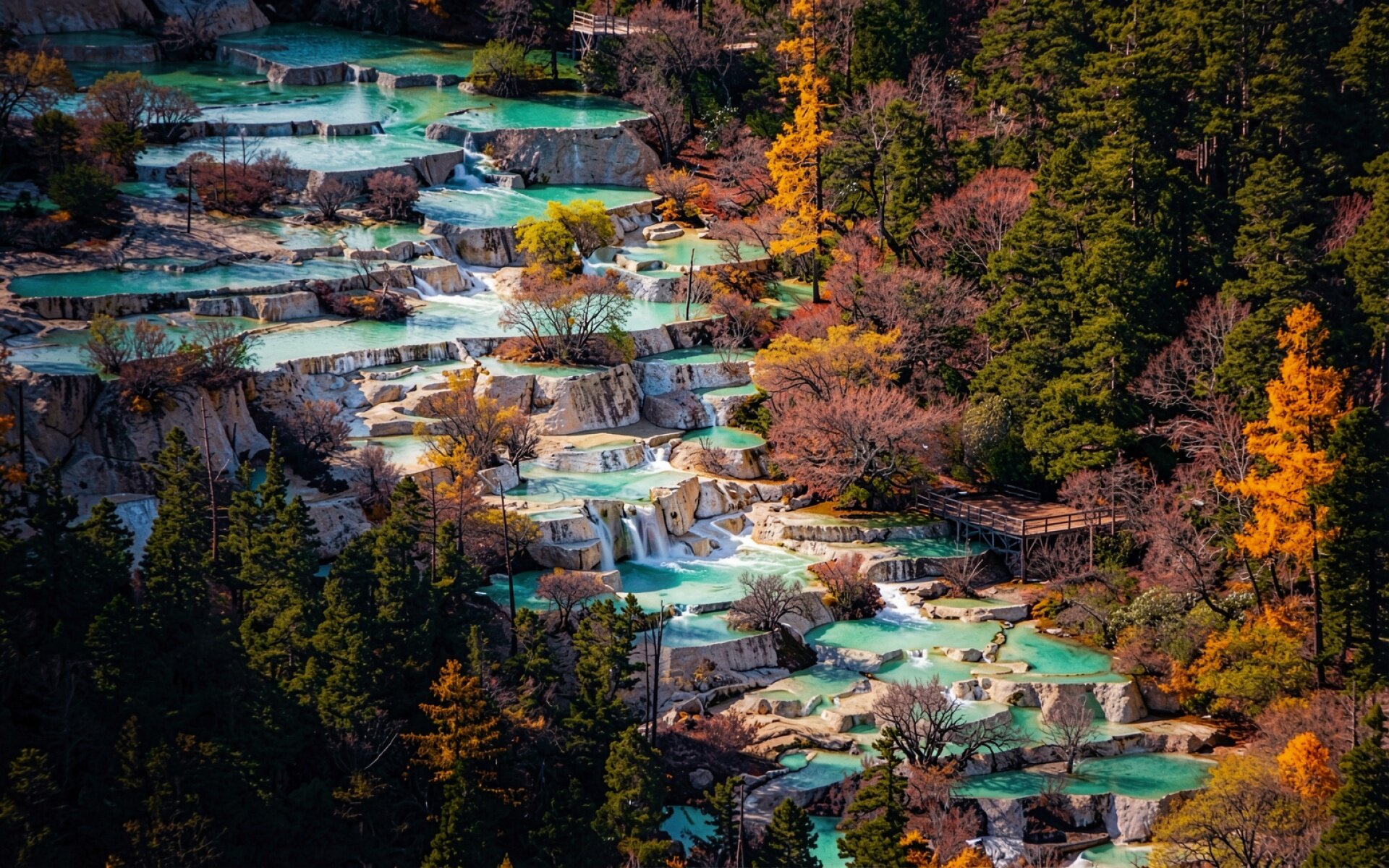 Бирюзовые террасные озера в осеннем хвойном лесу