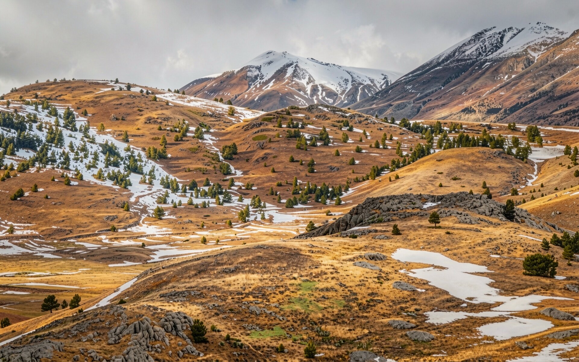 Горный пейзаж с заснеженными вершинами и желтой травой