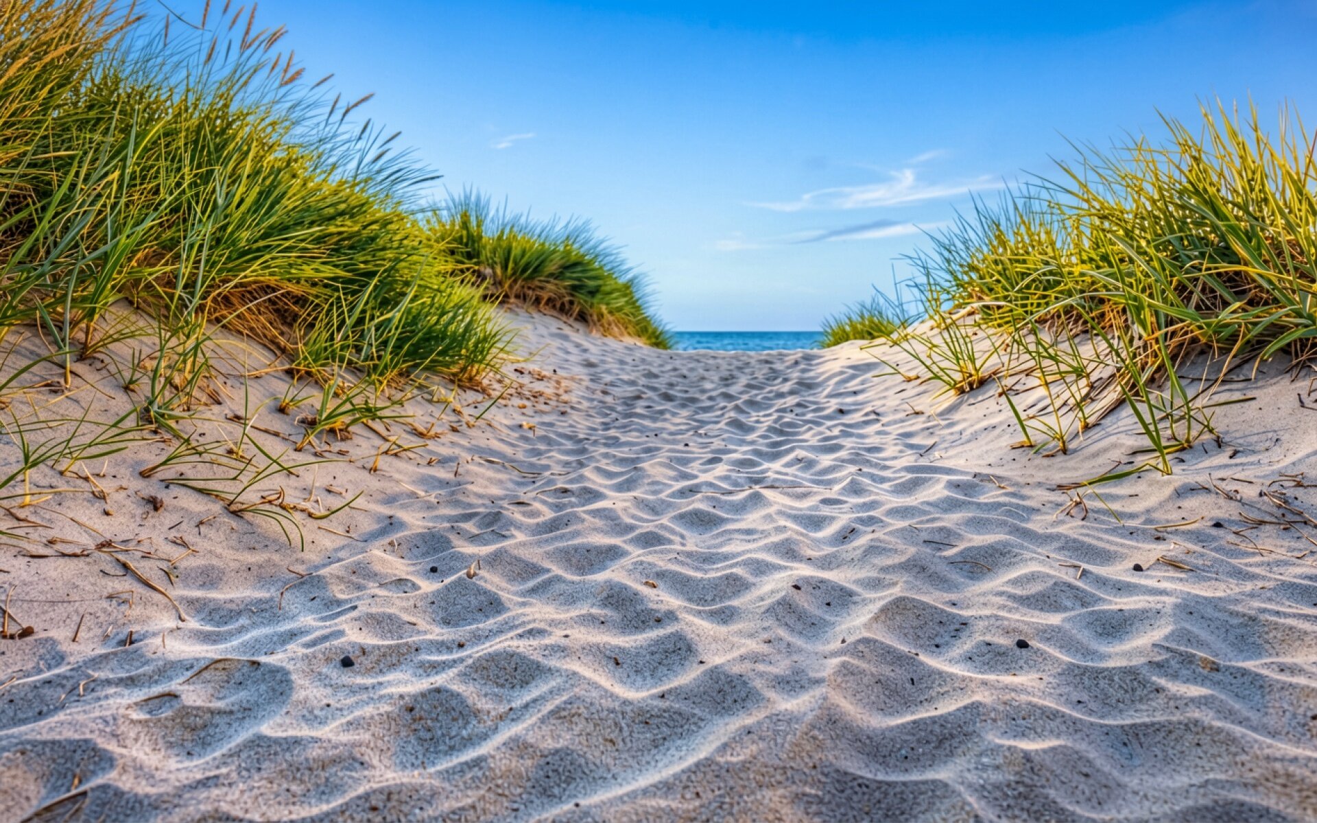Песчаная тропа между зелеными дюнами у моря