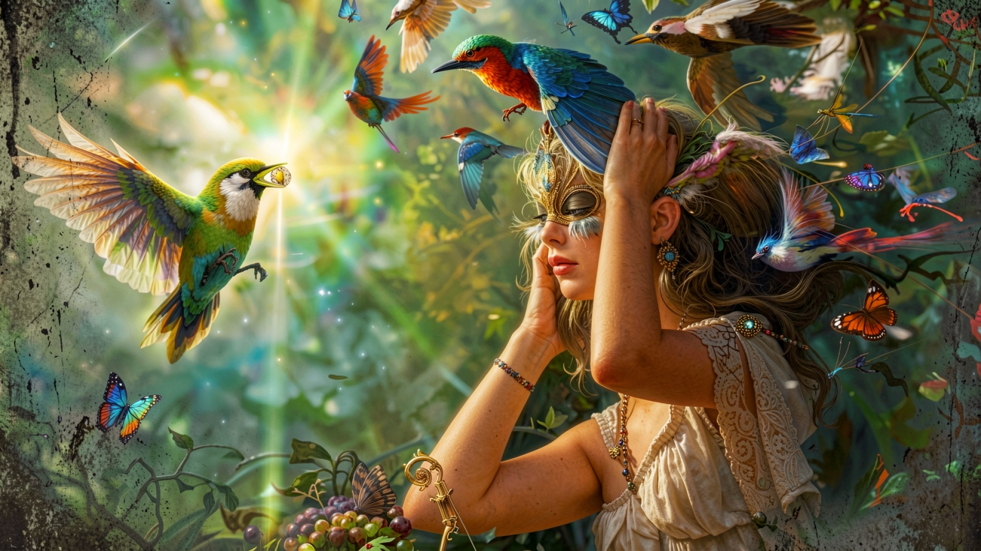 Девушка в лесу с тропическими птицами