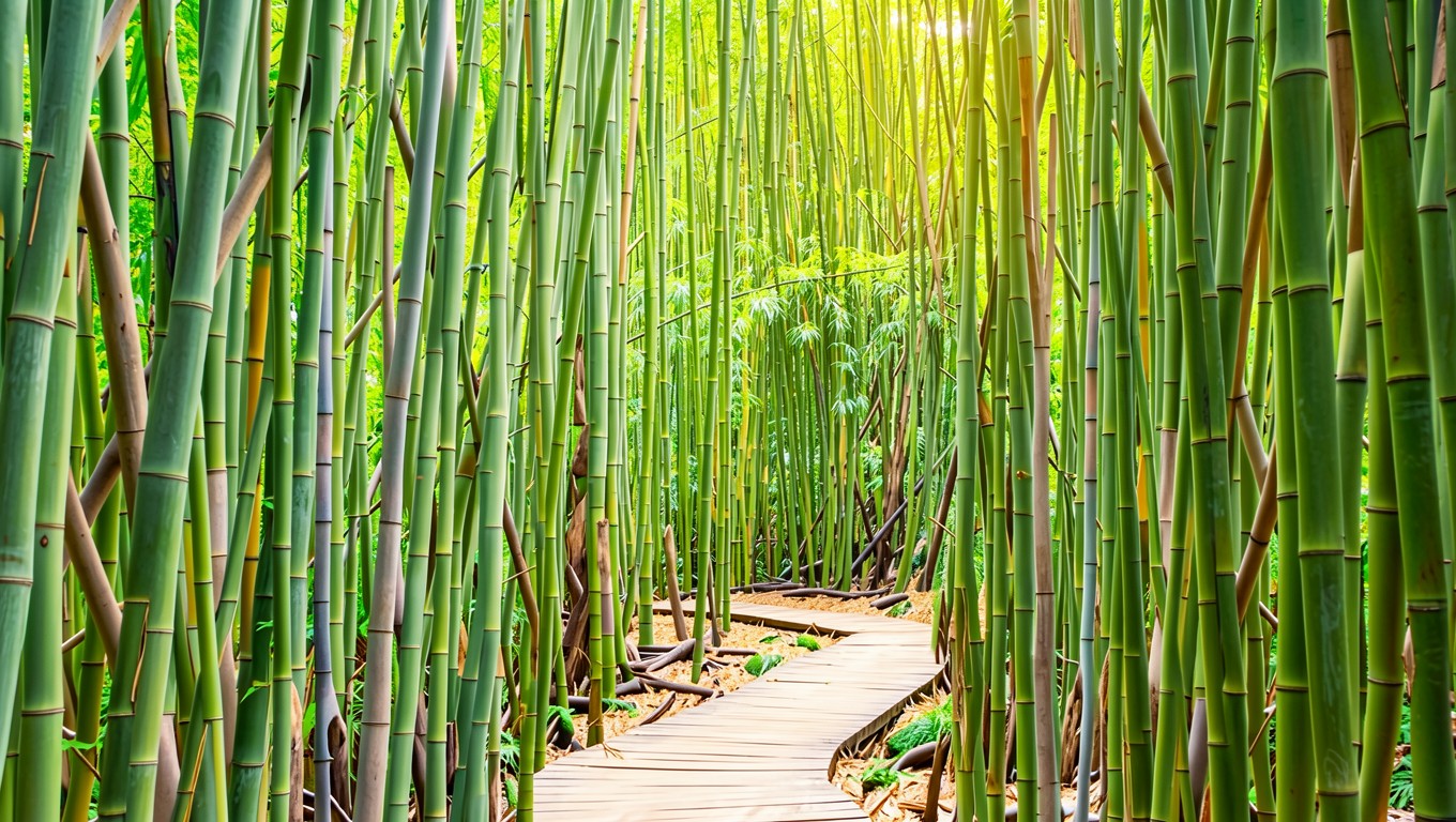 Бамбуковый лес с деревянной тропой в солнечный день
