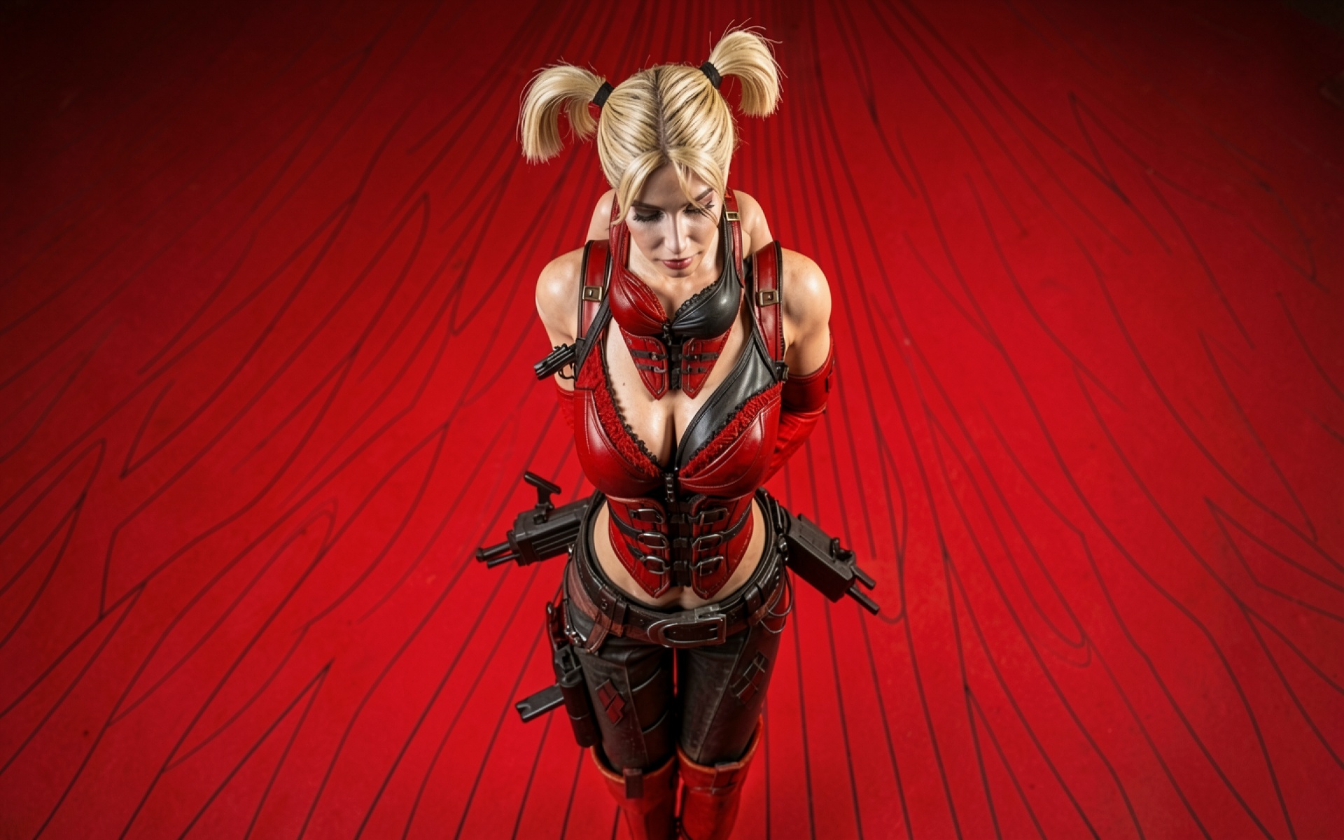 Девушка в красном тактическом костюме на фоне узоров