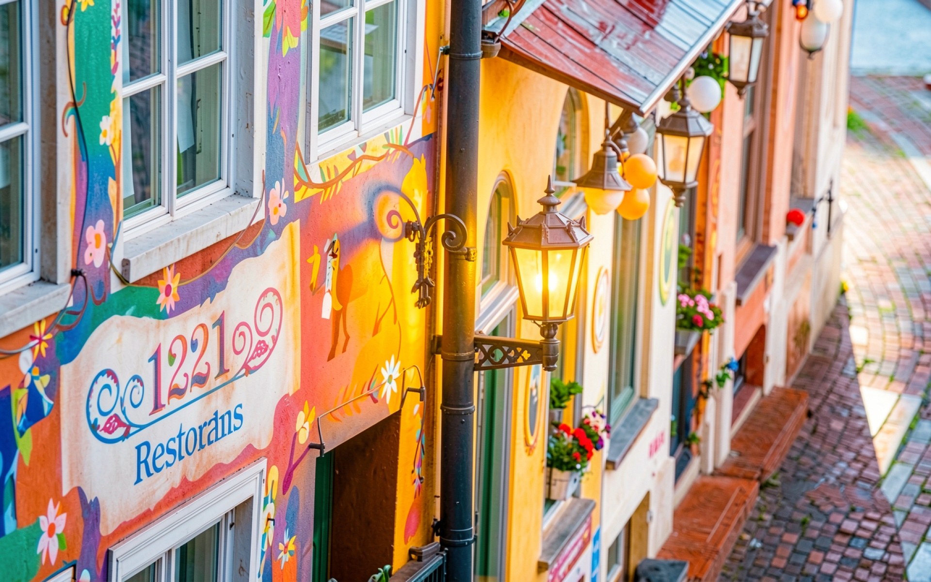 Разноцветные дома старого города с уличными фонарями