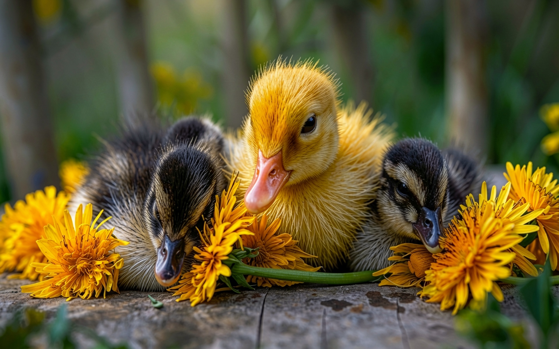 Три маленьких утенка среди желтых одуванчиков