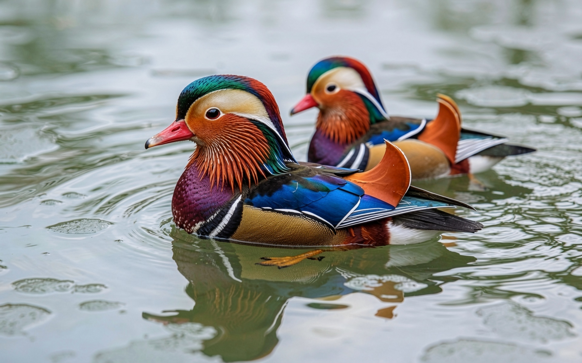Две яркие утки-мандаринки в спокойной воде