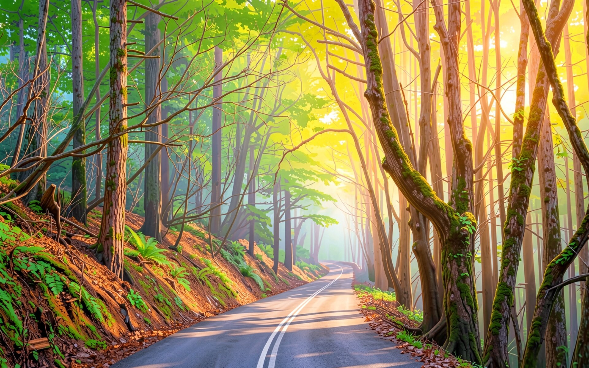 Лесная дорога в солнечных лучах утра