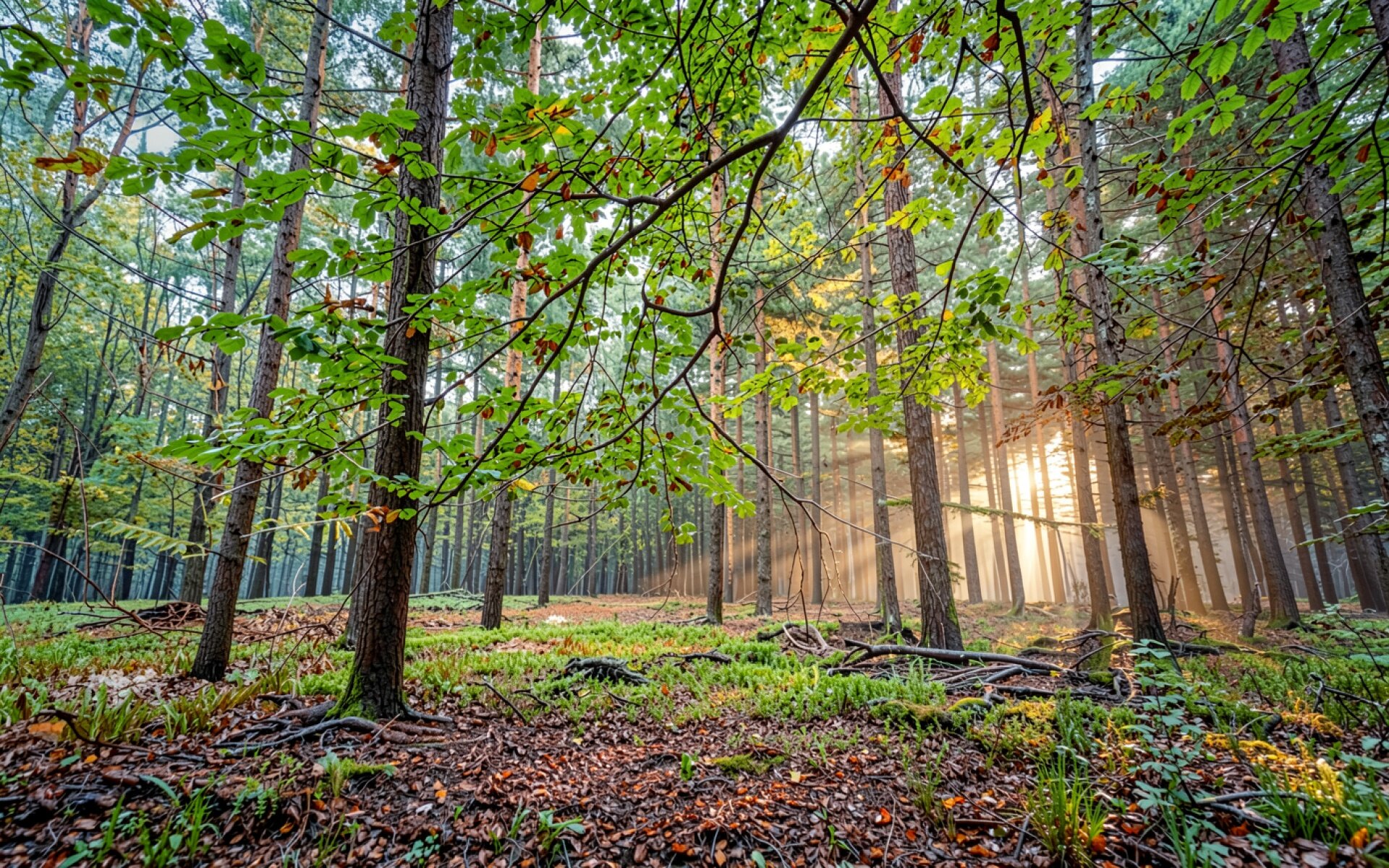 Сосновый лес с утренним туманом и солнцем