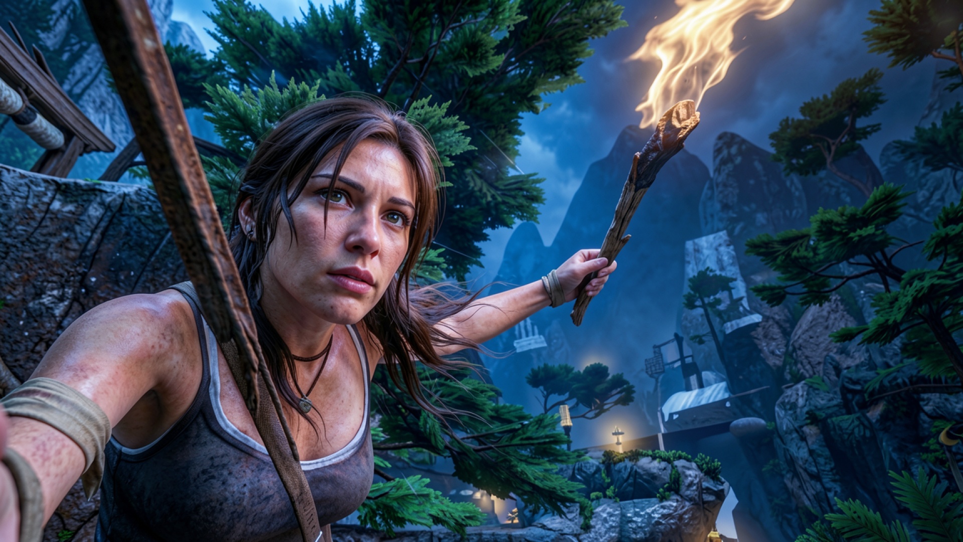 Лара Крофт с факелом в темных джунглях