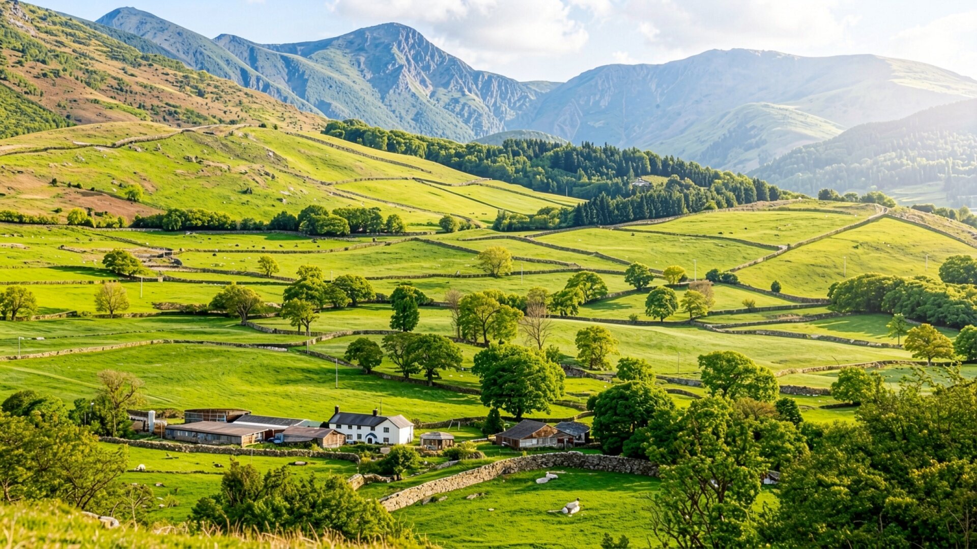 Зеленый сельский пейзаж с горами и фермой