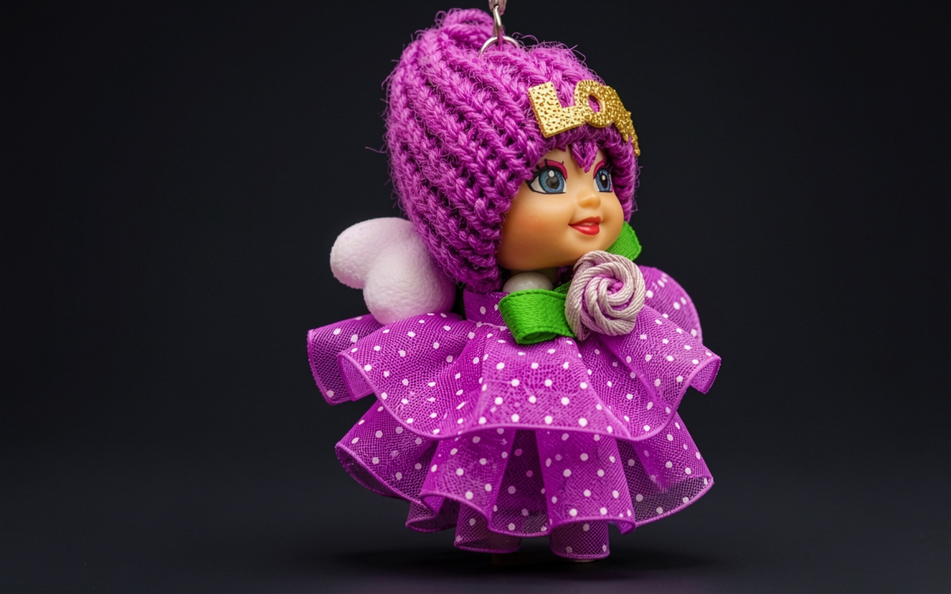 Фигурка куклы в пурпурном платье на черном фоне