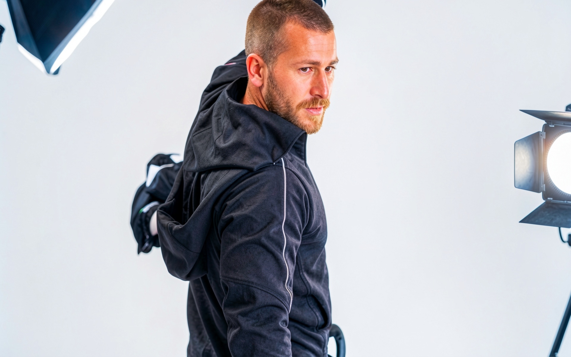 Мужчина в черном худи в фотостудии