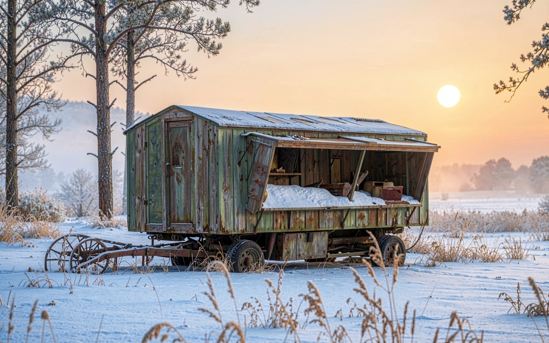 Старый деревянный фургон в зимнем поле