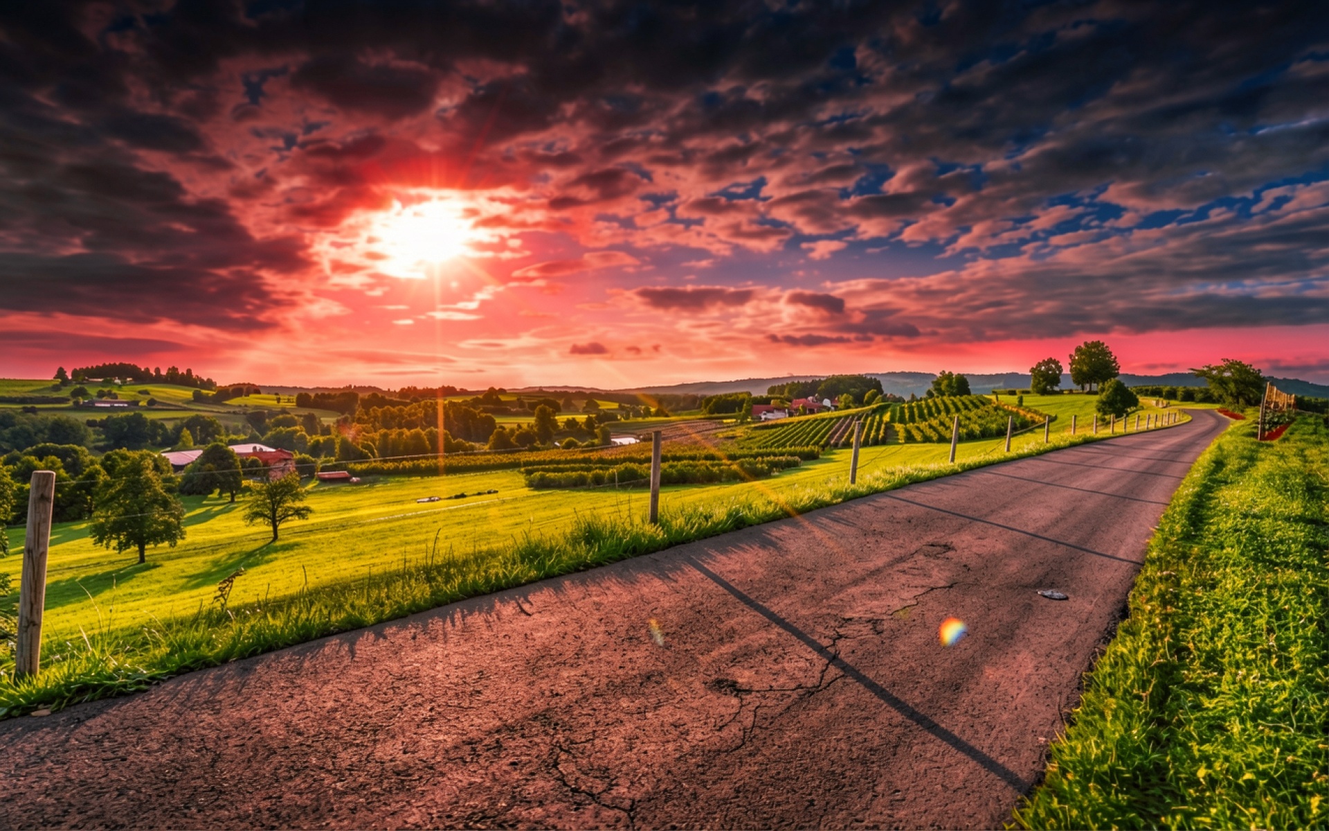 Закат над сельской дорогой в зеленых холмах
