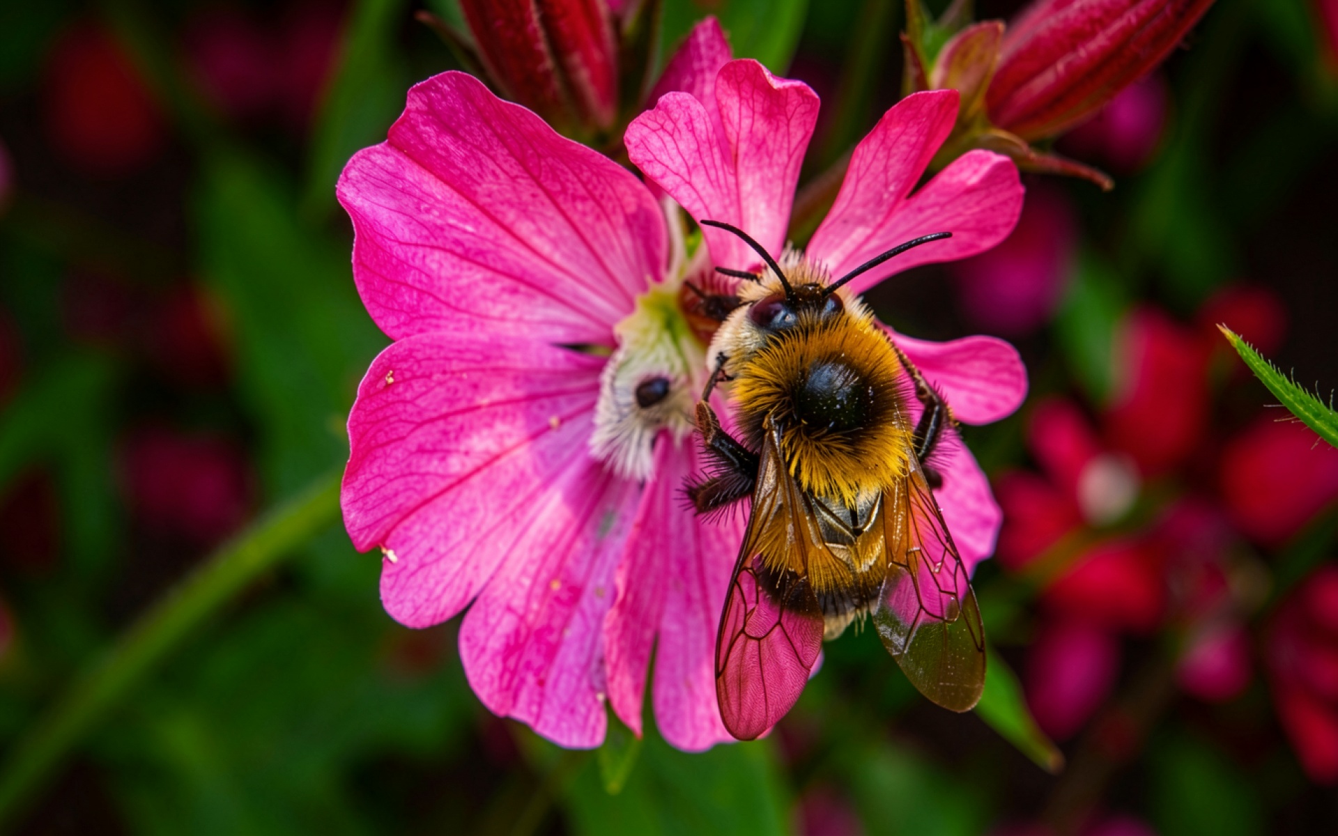 Шмель на ярко-розовом цветке в саду