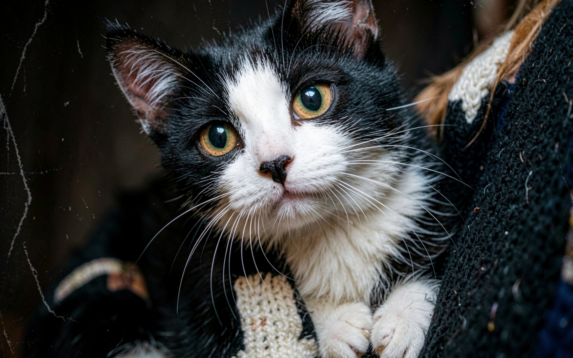 Черно-белый кот в темном уютном интерьере