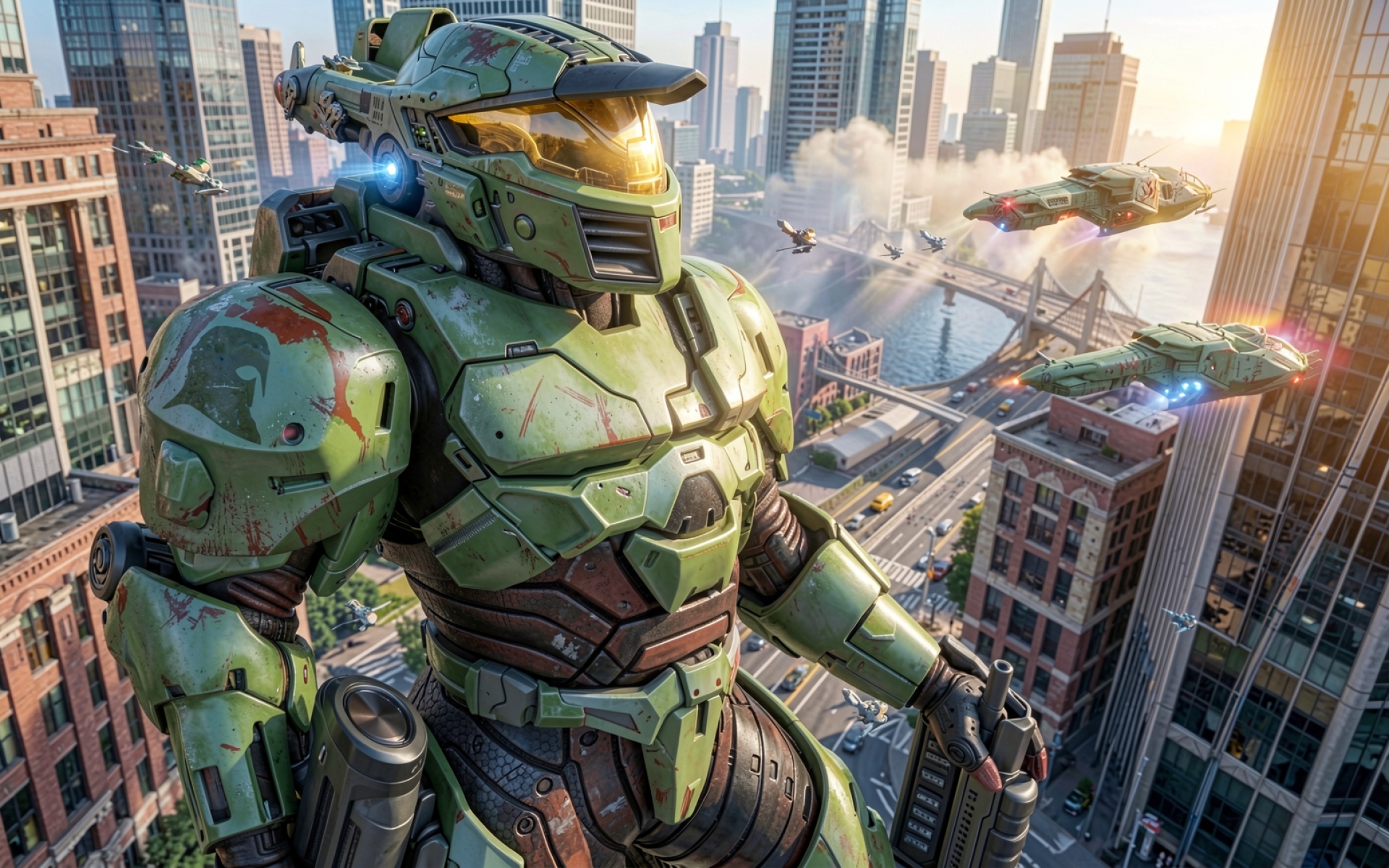 Мастер Чиф в зеленой броне среди небоскребов