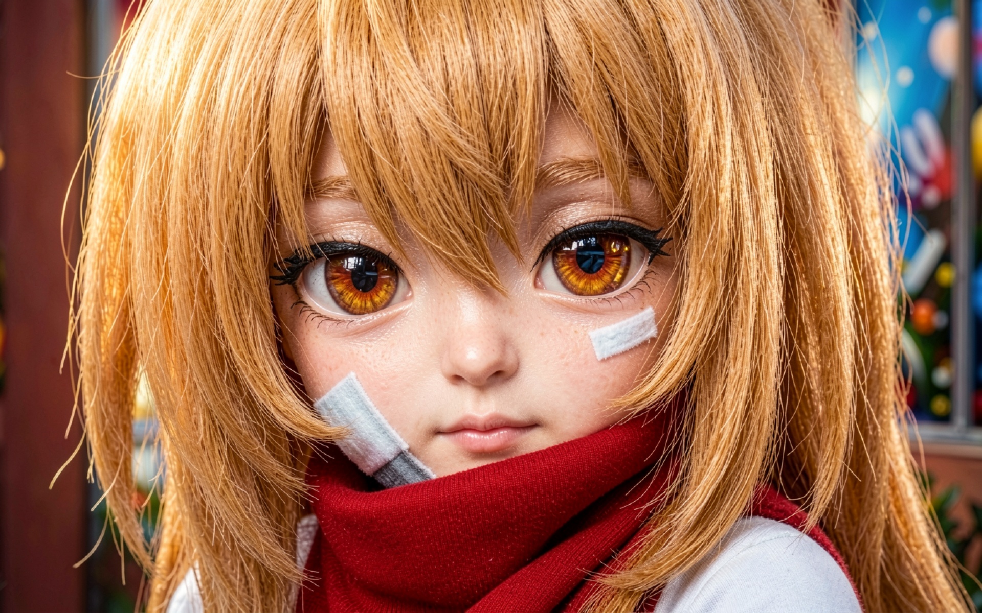 Девушка в косплее с рыжими волосами и красным шарфом