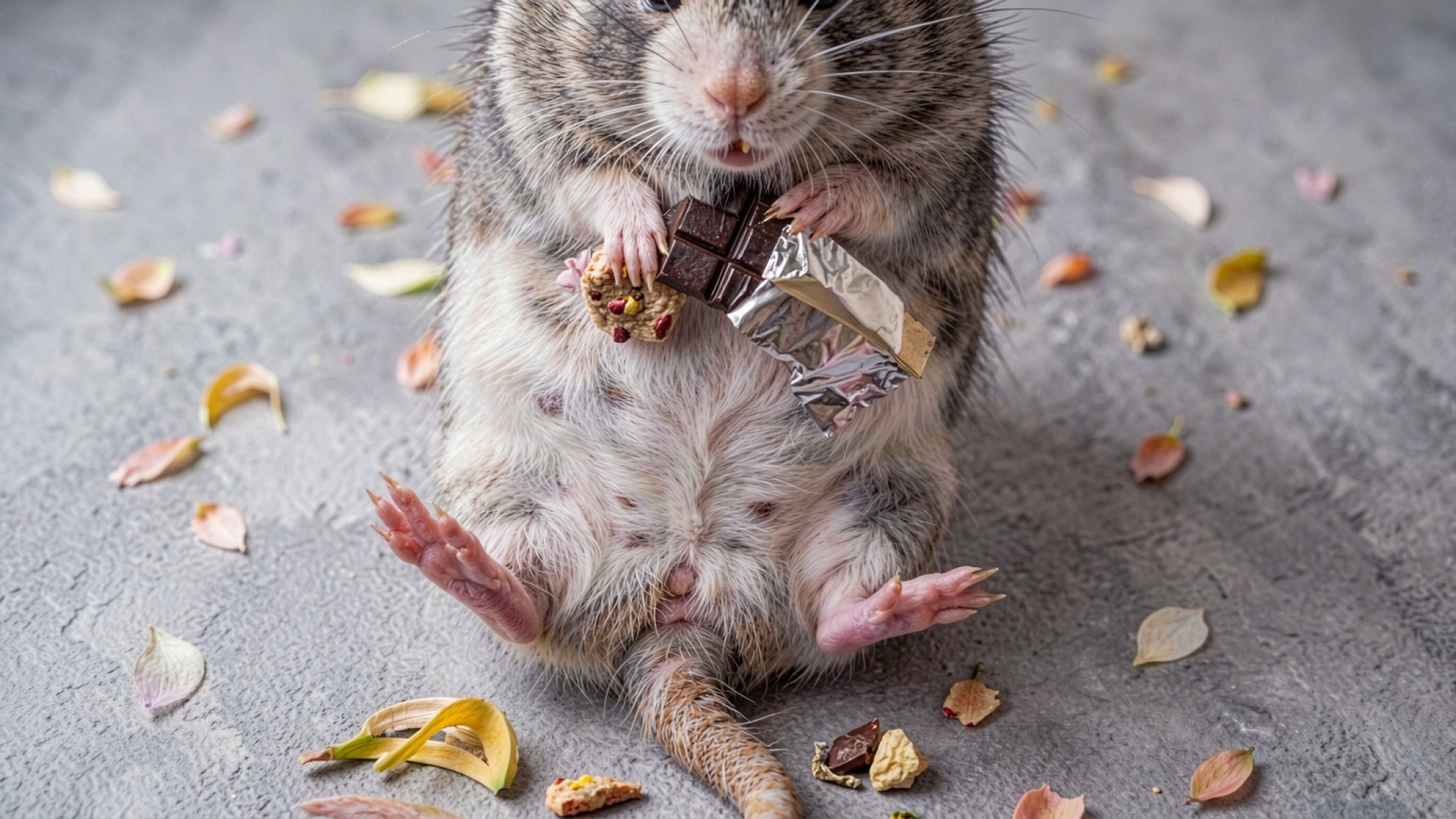 Серый хомяк с шоколадкой на бетонном полу