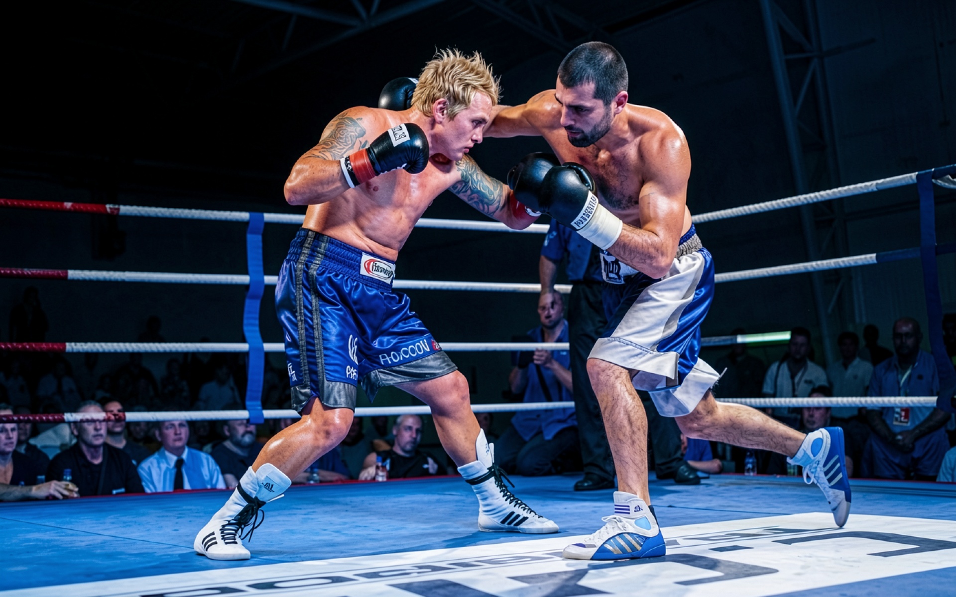 Боксеры в синих шортах на ринге
