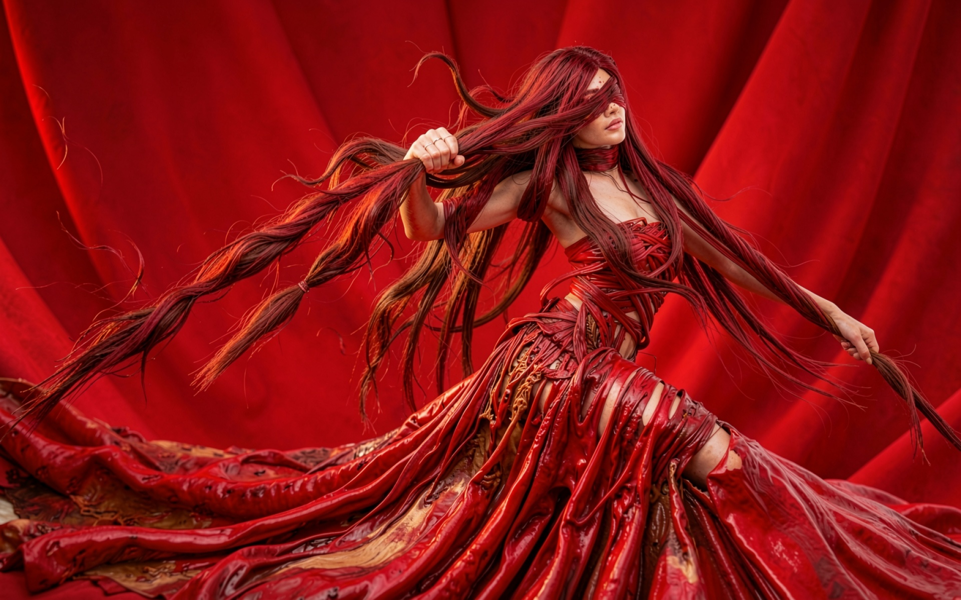 Девушка в красном платье на фоне штор
