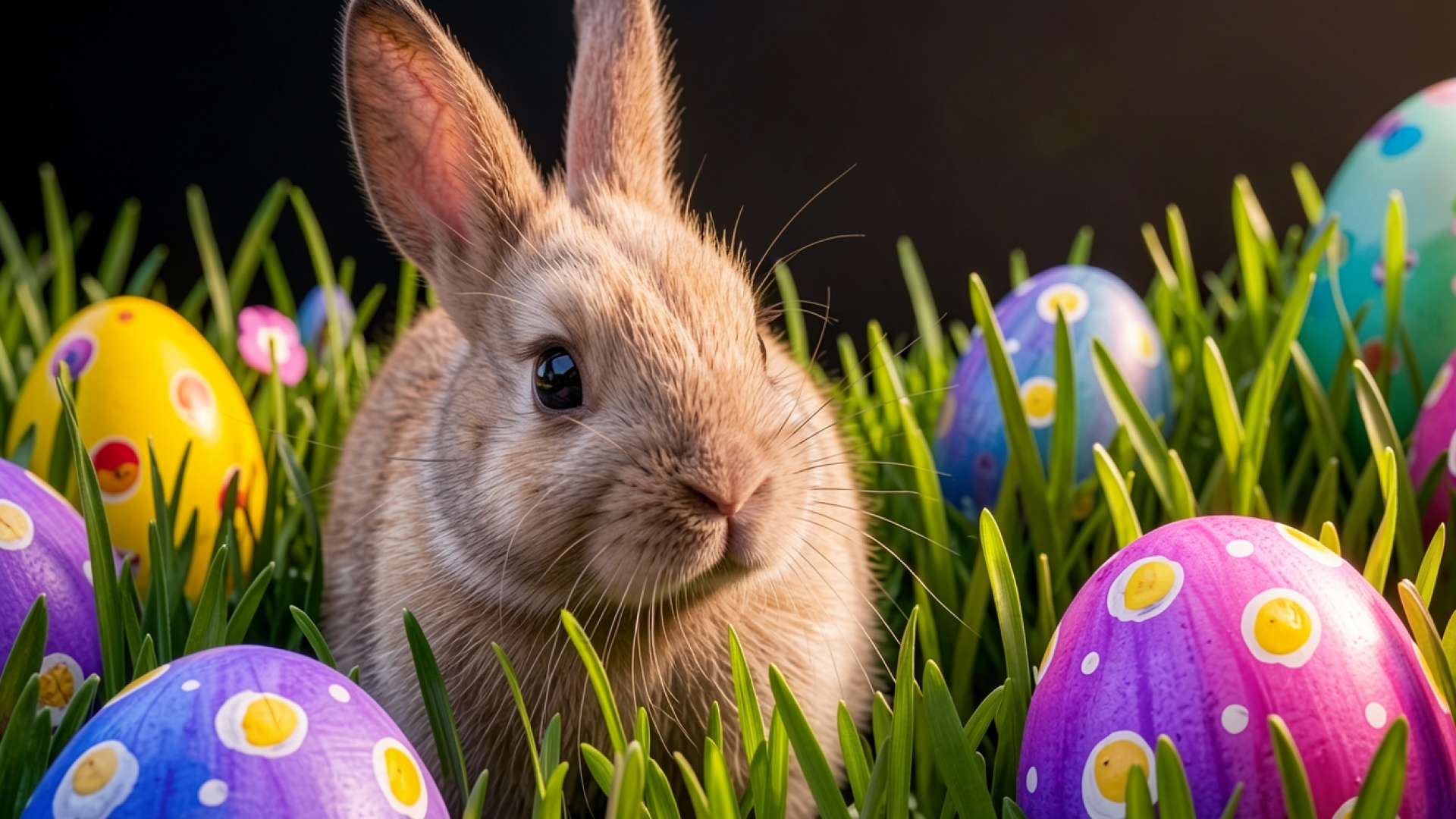 Коричневый кролик среди цветных пасхальных яиц в траве