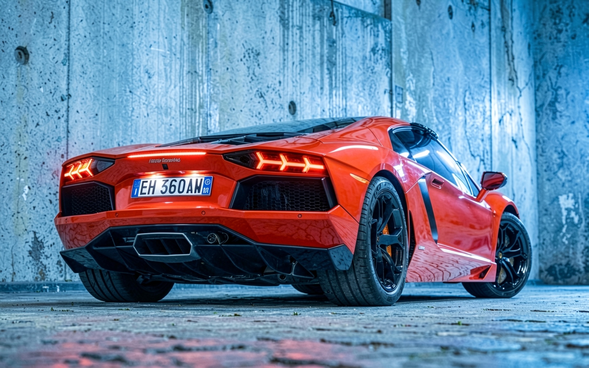 Красный суперкар Lamborghini Aventador в бетонном гараже