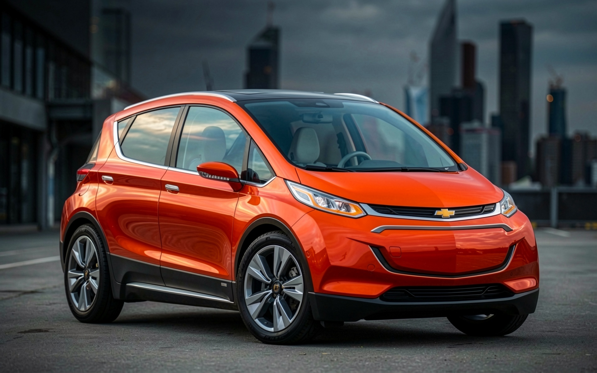 Оранжевый электромобиль Chevrolet Bolt в городском пейзаже
