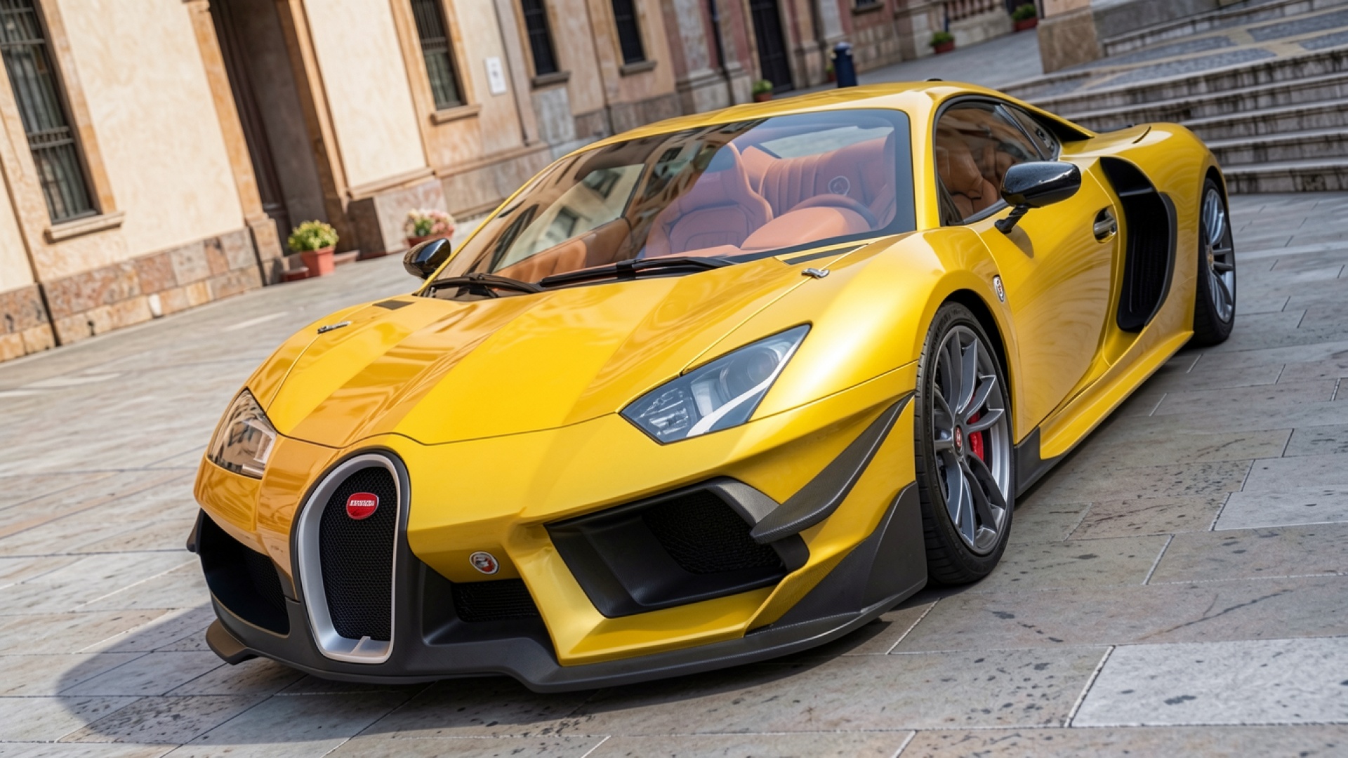 Желтый гиперкар Bugatti Chiron на городской площади