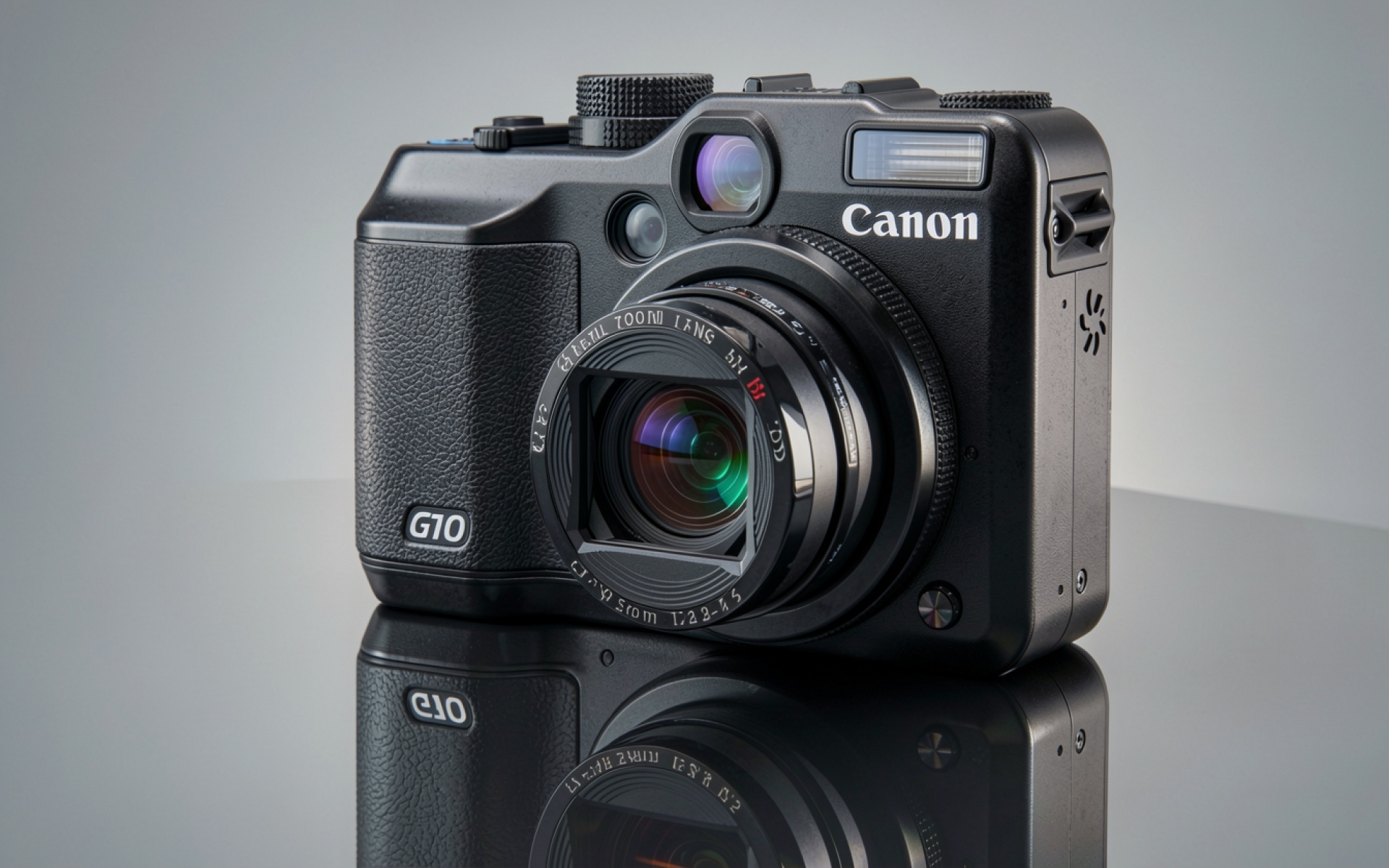 Черный цифровой фотоаппарат Canon G10 на сером фоне