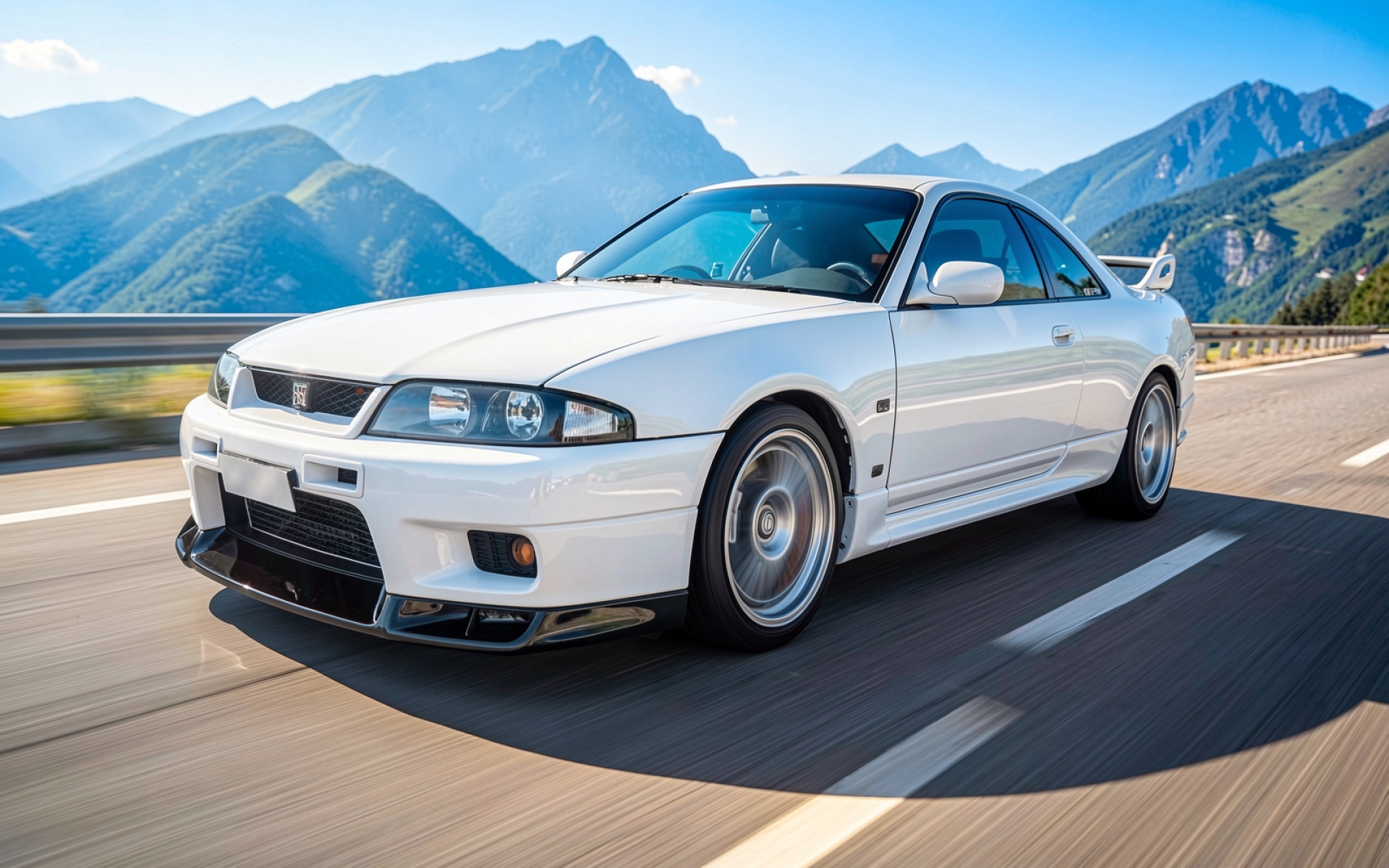 Nissan Skyline R34 белый спортивный автомобиль в горах