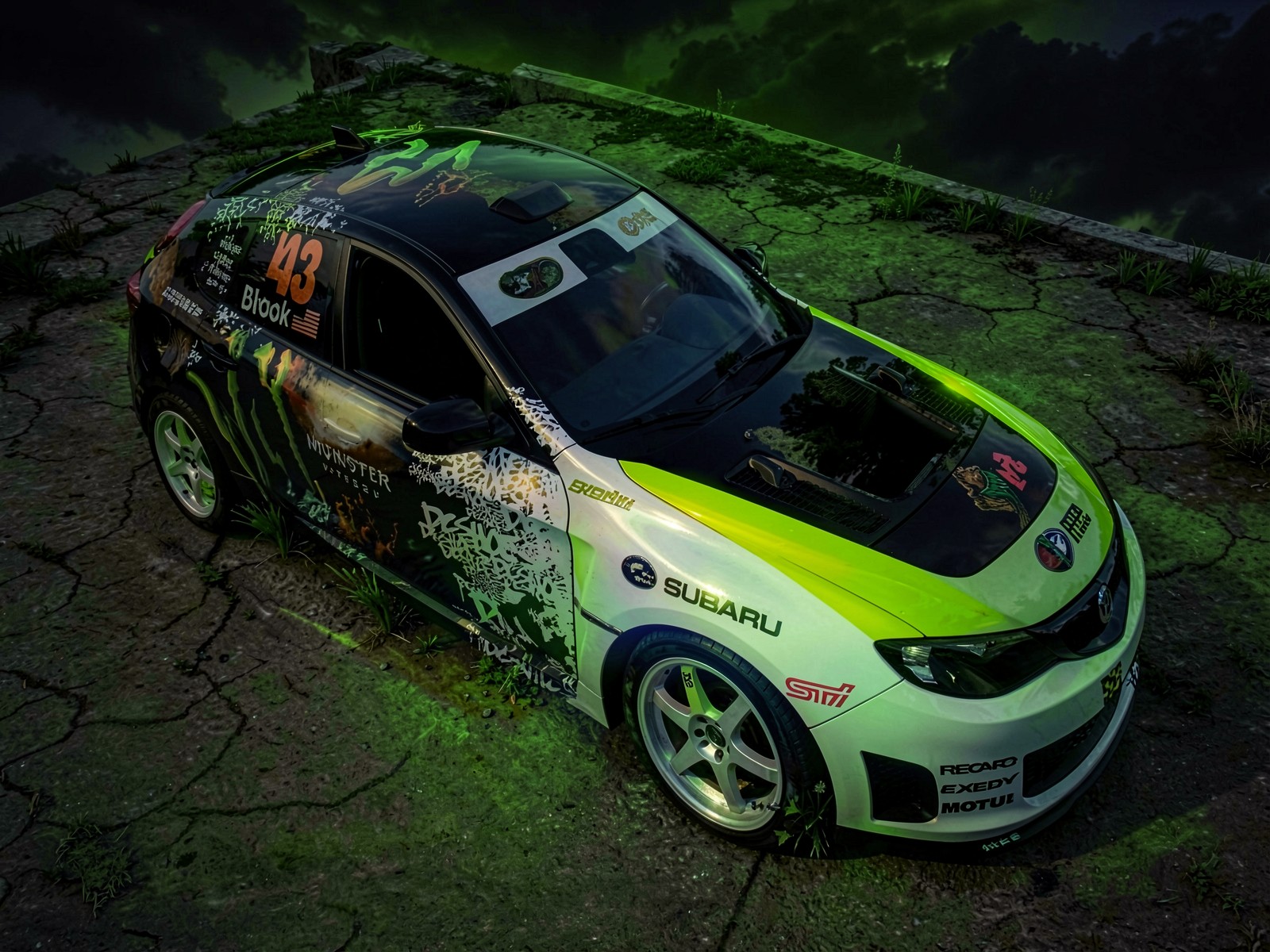 Гоночный автомобиль Subaru Impreza в зеленых тонах
