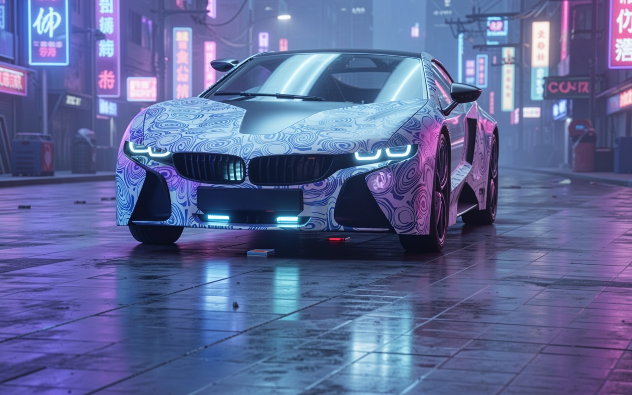 Спортивный автомобиль с узорами в неоновом городе