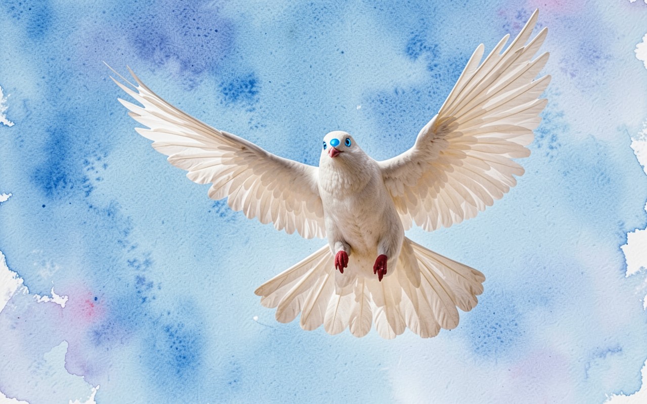 Белый голубь в полете на голубом акварельном фоне