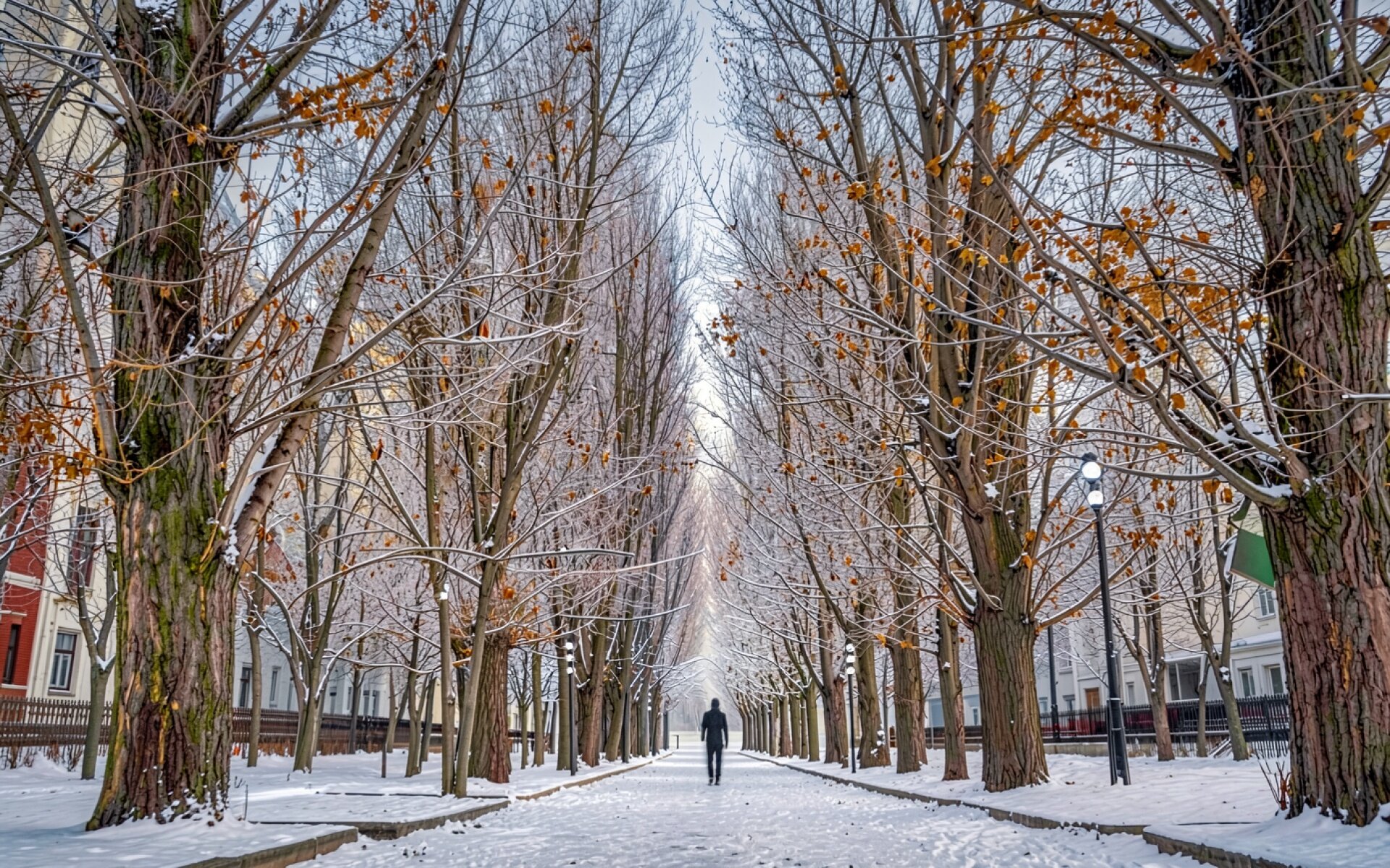 Зимняя аллея с каштанами и одиноким человеком